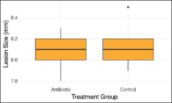 Fig. 12. Comparison of lesion size with and without antibiotics. No significant difference in ONF lesion size was observed between treatment groups (p > 0.05). Boxes show the IQR with the median line. DiscussionThis pioneering case illustrates the successful closure of a chronic ONF in a European wildcat using tissue engineering and microbial profiling. The PRF-bone marrow/PEGDA composite scaffold provided a biocompatible, osteoconductive matrix that promotes mucosal regeneration without adverse effects on kidney function. Serial microbiome analyses demonstrated that ONF development triggers dysbiosis characterized by reduced alpha diversity and enrichment of opportunistic pathogens. These microbial shifts likely contribute to persistent inflammation and delayed healing, paralleling findings in human cleft palate patients where Enterococcus and Staphylococcus species are implicated in fistula persistence (Rajasekaran et al., 2024). Antibiotic therapy transiently suppressed bacterial abundance but did not improve closure outcomes, consistent with the finding that antibiotics alone cannot restore microbiome homeostasis or promote tissue regeneration (Belkaid and Hand, 2014). Although this study lacked a control group, comparisons were made to the healthy contralateral mucosa of the animal and published data for healthy felids. The gradual reestablishment of commensal communities post-surgery highlights the resilience of the oral microbiome and its role in maintaining mucosal health.Future studies should explore the use of adjunctive probiotics or microbiome-targeted therapies to optimize healing. Our biomarker analysis revealed that scaffold integration coincided with IL-6 normalization, suggesting that PEGDA may mitigate prolonged inflammation. Our findings contribute novel insights into oral wound healing in wild felids and support the translational potential of PRF-bone marrow composites combined with 3D-printed scaffolds for complex maxillofacial defects. This approach may reduce morbidity and improve the quality of life of both captive and free-ranging felids affected by oral pathologies. Although our results demonstrate the feasibility of this approach, the single-case design inherently restricts generalizability. Future studies should prioritize controlled trials with larger cohorts and compare outcomes across species (e.g., domestic cats vs. wild felids) and treatment modalities (e.g., PRF-scaffold vs. traditional flaps). The single-case design of this study prevents broad generalizations, and the lack of a control group restricts causal inferences. Future controlled trials with larger cohorts are needed to validate these findings. Table 4. Inflammatory biomarkers and microbiome data in the case of F. silvestris - new secondary analysis.