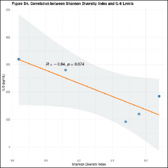 Fig. 14. Negative correlation between microbial diversity and systemic inflammation. Scatter plot showing the relationship between the Shannon diversity index (x-axis) and serum IL-6 concentrations (y-axis) in F. silvestris during healing of the oronasal fistula. The orange regression line (with 95% confidence band in gray) demonstrates a significant inverse correlation (Pearson’s r=−0.82, p < 0.01). Each point represents a paired microbiome-inflammatory measurement at different timepoints (pre-op, POD 7, and POD 30).