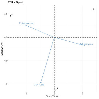 Fig. 15. Principal component analysis of immune-microbiome interactions. Biplot showing the relationship between host immune parameters (CD4+/CD8+ ratio) and dominant microbial taxa (Actinomyces and Enterococcus) across healing stages. The arrows represent the variable loadings on PC1 (X-axis) and PC2 (Y-axis), with their length and direction indicating the contribution to variance. Colored points correspond to timepoints (Pre-op=red, POD 7=blue, POD 30=green). Data were scaled and centered before PCA (FactoMineR package, R v4.2.2). ConclusionThis case report provides preliminary evidence that PRF-PEGDA scaffolds can promote ONF healing despite microbial dysbiosis. The strong inverse correlation between IL-6 and Shannon diversity (Fig. 14) highlights microbiome-immune interactions that require further study. Controlled trials are needed to validate these findings. AcknowledgmentsThe authors wish to express their deepest gratitude to the Laleh Veterinary Laboratory in Tehran, Iran, for providing the advanced facilities and technical support essential for this study. We are particularly indebted to Dr. Laleh Ziaei, Head of the Wildlife Research Division, for her exceptional leadership, unwavering dedication to wildlife conservation, and invaluable assistance throughout the research process. We also extend our sincere thanks to the CEO, Dr. Peyman Mohammadzadeh, for his visionary support and for fostering a research environment that made this pioneering work possible. Conflict of interestThe authors have no competing interests to declare. FundingThis research received no specific grant. Author contributionsM. Peyman: Study design, data analysis, and manuscript writing. S. Negin: Data collection and laboratory work. Behnaz M.: Surgical intervention and follow-up. Data availabilityThe data that support the findings of this study are not openly available due to sensitivity reasons and are available from the corresponding author upon reasonable request. Ethical statementAll procedures conformed to the ethical standards of the Institutional Animal Care and Use Committee of the Department of Environment. The study was approved by IAU/DOE/2023-027. Compliance: Directive 2010/63/EU and AAHA/AAFP 2022 guidelines. The study was conducted with informed consent from Eram Zoo. To minimize additional blood draws, serum samples were obtained during clinically indicated venipuncture. ReferencesAlhindi, N.A., Sindi, A.M., Binmadi, N.O. and Elias, W.Y. 2019. A retrospective study of oral and maxillofacial pathology lesions diagnosed at the Faculty of Dentistry, King Abdulaziz University. Clin. Cosmet. Investig. Dent. 11, 45–52. Alves-Barroco, C., Rivas-García, L., Fernandes, A.R. and Baptista, P.V. 2020. Tackling multidrug resistance in streptococci–from novel biotherapeutic strategies to nanomedicines. Front. Microbiol. 11, 579916. Anderson, D.J., Chen, L.F., Weber, D.J., Moehring, R.W., Lewis, S.S., Triplett, P.F. and Sexton, D.J. 2017. Enhanced terminal room disinfection and acquisition and infection caused by multidrug-resistant organisms and Clostridium difficile: a cluster-randomised, multicentre, crossover study. Lancet 389(10071), 805–814. Bahar Tuna, E., Topçuoglu, N., Ilhan, B., Gençay, K. and Kulekçi, G. 2008. Staphylococcus aureus transmission through Oronasal fistula in children with cleft lip and palate. Cleft Palate. Craniofac. J. 45(5), 477–480. Belkaid, Y. and Hand, T.W. 2014. Role of the microbiota in immunity and inflammation. Cell 157(1), 121–141. Bolyen, E., Rideout, J.R., Dillon, M.R., Bokulich, N.A., Abnet, C.C., Al-Ghalith, G.A., Alexander, H., Alm, E.J., Arumugam, M., Asnicar, F., Bai, Y., Bisanz, J.E., Bittinger, K., Brejnrod, A., Brislawn, C.J., Brown, C.T., Callahan, B.J., Caraballo-Rodríguez, A.M., Chase, J., Cope, E.K., Da Silva, R., Diener, C., Dorrestein, P.C., Douglas, G.M., Durall, D.M., Duvallet, C., Edwardson, C.F., Ernst, M., Estaki, M., Fouquier, J., Gauglitz, J.M., Gibbons, S.M., Gibson, D.L., Gonzalez, A., Gorlick, K., Guo, J., Hillmann, B., Holmes, S., Holste, H., Huttenhower, C., Huttley, G.A., Janssen, S., Jarmusch, A.K., Jiang, L., Kaehler, B.D., Kang, K.B., Keefe, C.R., Keim, P., Kelley, S.T., Knights, D., Koester, I., Kosciolek, T., Kreps, J., Langille, M.G.I., Lee, J., Ley, R., Liu, Y.X., Loftfield, E., Lozupone, C., Maher, M., Marotz, C., Martin, B.D., Mcdonald, D., Mciver, L.J., Melnik, A.V., Metcalf, J.L., Morgan, S.C., Morton, J.T., Naimey, A.T., Navas-Molina, J.A., Nothias, L.F., Orchanian, S.B., Pearson, T., Peoples, S.L., Petras, D., Preuss, M.L., Pruesse, E., Rasmussen, L.B., Rivers, A., Robeson, M.S., Rosenthal, P., Segata, N., Shaffer, M., Shiffer, A., Sinha, R., Song, S.J., Spear, J.R., Swafford, A.D., Thompson, L.R., Torres, P.J., Trinh, P., Tripathi, A., Turnbaugh, P.J., Ul-Hasan, S., Van Der Hooft, J.J.J., Vargas, F., Vázquez-Baeza, Y., Vogtmann, E., Von Hippel, M., Walters, W., Wan, Y., Wang, M., Warren, J., Weber, K.C., Williamson, C.H.D., Willis, A.D., Xu, Z.Z., Zaneveld, J.R., Zhang, Y., Zhu, Q., Knight, R. and Caporaso, J.G. 2019. Reproducible, interactive, scalable and extensible microbiome data science using QIIME 2. Nat. Biotechnol. 37(8), 852–857. Cho, I. and Blaser, M.J. 2012. The human microbiome: at the interface of health and disease. Nat. Rev. Genet. 13(4), 260–270. Dewhirst, F.E., Chen, T., Izard, J., Paster, B.J., Tanner, A.C., Yu, W.H., Lakshmanan, A. and Wade, W.G. 2010. The human oral microbiome. J. Bacteriol. 192(19), 5002–5017. DOE Wildlife Ethics Committee, 2023. Wildlife Research Ethics: Guidelines and Approval Procedures. Tehran, Iran: Department of Environment. Approval Code: IAU/DOE/2023-027. Dohan Ehrenfest, D.M., Rasmusson, L. and Albrektsson, T. 2009. Classification of platelet concentrates: from pure platelet-rich plasma (P-PRP) to leucocyte- and platelet-rich fibrin (L-PRF). Trends Biotechnol. 27(3), 158–167. Gallardo-Navarro, O., Aguilar-Salinas, B., Rocha, J. and Olmedo-Álvarez, G. 2024. Hig