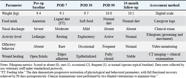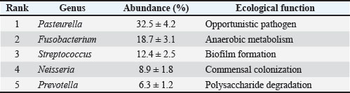 Clinical outcomeThe ONF implant and flap closure were well tolerated, with no immediate postoperative complications. By day 30, the mucosa appeared fully epithelialized with no signs of inflammation or dehiscence. At 3 and 10 months, CT scans revealed progressive scaffold resorption and localized bone regeneration at the implant site. Renal parameters remained stable throughout follow-up. No adverse events (e.g., inflammatory reactions, infections, or implant rejection) were observed during the 10-month follow-up period. Mild suture loosening occurred on POD 6 but resolved without intervention. Systemic biomarkers (IL-6, TNF-α) normalized by POD 30, indicating no prolonged inflammation. Microbiome dynamicsPreoperative samples from the ONF site showed decreased alpha diversity compared with the contralateral healthy mucosa (Shannon index mean ± SD: 3.1 ± 0.4 vs. 5.2 ± 0.3; p=0.003). Beta diversity analysis demonstrated distinct clustering of ONF versus healthy samples (Performance-based multiple-measures analysis of variance, p=0.001). On day 7 post-surgery, microbial diversity at the ONF margin further decreased, coinciding with antibiotic therapy (enrofloxacin 5 mg/kg PO SID × 14 days). Key opportunistic genera, such as Enterococcus (0.5% pre-op → 12.8% day 7), Staphylococcus (1.2% → 9.6%), and Pseudomonas (0.3% → 5.4%), expanded significantly (p < 0.01). After antibiotic cessation, diversity partially recovered by day 30 but remained below baseline (p=0.045) (Table 3). By day 90, the microbiome composition resembled healthy mucosa, with an increased abundance of commensal taxa, including Actinomyces and Veillonella. By days 180 and 300, the oral microbiota had stabilized, and no signs of persistent infection or dysbiosis were evident (Figs. 10–12) suggesting a restoration of a more commensal and stable microbial community structure (Gallardo-Navarro et al., 2024). Table 3. Top 5 bacterial genera and their functional roles.