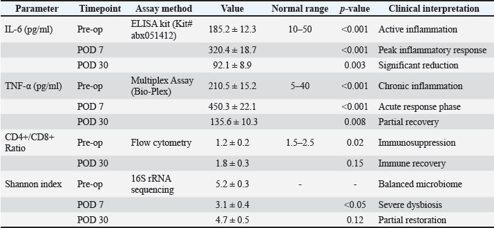 Fig. 13. Temporal dynamics of inflammatory biomarkers during healing of oronasal fistula. Serum concentrations of IL-6 (blue line, left axis) and TNF-α (orange line, right axis) were measured preoperatively (Pre-op), at POD 7, and at POD 30. Error bars represent the SEM (n=3 technical replicates). Asterisks indicate significant differences versus preoperatively (**p < 0.01, ***p < 0.001, two-way ANOVA with Bonferroni correction). The shaded area highlights the peak inflammatory phase that coincides with dysbiosis of the microbiome (Fig. 14).