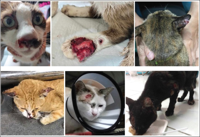 Fig. 1. Lesions in cats infected with Sporothrix spp. This image is from the Terdthai Love Pet Clinic. This study used itraconazole at a dose of 30 mg/kg/day (not exceeding 100 mg/day), combined with a liver supplement, and doxycycline at 10 mg/kg/day for 30 days in cases with Mycoplasma spp. infection to treat cats with sporotrichosis (Gremião et al., 2022). Complete follow-up data were available for all five cats. Of these, two tested negative for FIV and FeLV, two were FeLV-positive, and one was FIV-positive. Lesions resolved within 3 months of treatment. Therapy was continued for an additional 3 months, resulting in a total treatment duration of 6 months. A 1-year follow-up revealed no disease recurrence. The recovery time did not differ between cats infected with retroviruses and those not infected. This finding is consistent with that of de Miranda et al. (2018), who reported that the recovery time from sporotrichosis in cats was not associated with retrovirus infection. Treatment outcomes could not be assessed in other cases in the present study because the owners discontinued treatment due to financial constraints. Other drugs reported for the treatment of feline sporotrichosis include potassium iodide (Reis et al., 2024), a combination of itraconazole and potassium iodide (Reis et al., 2024), terbinafine (Viana et al., 2024), and amphotericin B (Gremião et al., 2022). The treatment of cats infected with sporotrichosis requires special care because the disease is slow to cure and can be transmitted to humans. Owner cooperation is essential for successful treatment and recovery. Previous reports have shown that cats whose owners follow veterinary treatment guidelines recover more quickly than those whose owners do not (de Souza et al., 2024). Keeping infected cats in a closed system is also crucial, as it helps prevent the spread of the infection to other cats. Currently, there is no effective vaccine to prevent sporotrichosis (de Almeida et al., 2019). Therefore, preventive care and educating owners about the seriousness of this disease should be prioritized. Future studies should expand the study area, investigate Sporothrix genetic differences in each region, examine other factors affecting virulence and recovery time, and educate cat owners on proper care in accordance with animal welfare standards, including penalties for improper handling.