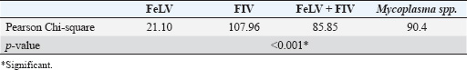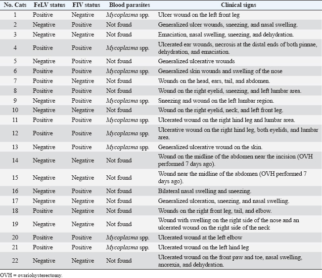 ABSTRACTBackground: Sporotrichosis is a zoonotic fungal infection caused by Sporothrix species and is a growing concern in feline populations due to its potential for transmission to humans. In Thailand, data on the incidence and associated risk factors remain limited, particularly in urban areas such as Bangkok. Aim: To investigate the incidence and potential risk factors of feline sporotrichosis in Thonburi District, Bangkok, Thailand, from 2018 to 2024. Methods: A retrospective review of clinical records was conducted at a veterinary clinic in Thonburi. Among the 1,030 cats examined, 22 cases of sporotrichosis were confirmed through cytological examination. Data collected included sex, neuter status, age, husbandry system, feline leukemia virus (FeLV)/feline immunodeficiency virus (FIV) infection status, and blood parasite infections. Statistical analysis using the chi-square test was performed to identify significant associations between infections and risk factors. Results: The incidence of sporotrichosis was 2.14%. Infected cats were evenly distributed between sexes, with 68.18% being unneutered. All infected cats were domestic shorthairs raised in open systems. Clinical signs included ulcerative skin lesions, sneezing, nasal swelling, anorexia, and dehydration. Co-infection with FeLV, FIV, and Mycoplasma spp. was common. Significant associations were found between sporotrichosis and FeLV, FIV, and Mycoplasma spp. infections (p < 0.001). Follow-up data from five treated cats showed complete recovery within 6 months using itraconazole, with no recurrence after 1 year. Conclusion: Feline sporotrichosis in Thonburi is significantly associated with open husbandry systems and immunosuppressive viral infections. Effective treatment is possible but requires long-term owner compliance. Public education on closed-system cat care and early diagnosis should be included in preventive strategies. These findings support the relevance of the One Health approach in managing zoonotic fungal diseases in urban settings. Keywords: Cat, FeLV, FIV, Mycoplasma spp., Sporotrichosis. IntroductionSporotrichosis is a fungal infection that affects both animals and humans (Rabello et al., 2022). Sporothrix infection is caused by fungi of the genus Sporothrix and can spread through direct contact with open wounds or scratches from infected animals (Alvarez et al., 2022). The fungus is naturally present in the environment, and cats are considered to be the main vectors of this disease (Santos et al., 2024). Infected cats can transmit the disease to other cats through scratches, bites, or wounds on their bodies (Santos et al., 2024). Uncontrolled cat outbreaks can impact animal welfare and lead to legal issues related to animal cruelty (Machado et al., 2021). The incidence of sporotrichosis in cats remains unclear in many countries, although evidence suggests that it is increasing (Santos et al., 2024). Infected cats can spread to stray cat populations, causing difficult-to-control outbreaks and increasing the risk of transmission to humans (Charles-Niño et al., 2022). In medical and epidemiological terms, sporotrichosis is classified as a zoonotic fungal infection that poses a significant public health concern (Charles-Niño et al., 2022). Cat outbreaks can lead to human infection through scratches, bites, or contact with secretions from an infected cat (Silva Neto et al., 2023). If not treated promptly, this can result in a fungal skin infection that may spread to internal organs (Yeow et al., 2023). Diagnosis of feline sporotrichosis is crucial for controlling the spread of infection. The external appearance of lesions in infected cats may resemble other diseases, such as cryptococcosis or bacterial infection (Lin et al., 2023). Therefore, specialized tests, including cytological examination (Makri et al., 2020), culture (Spinelli et al., 2021), or molecular testing (Boechat et al., 2022), are required to confirm the infection. Potential risk factors for infection in cats include open-household systems and latent viral infections that compromise the immune system, such as feline leukemia virus (FeLV) or feline immunodeficiency virus (FIV), which may influence disease severity and transmission potential (Nakasu et al., 2021). Therefore, studying these factors is important for assessing the risk of community transmission and determining appropriate control measures. Materials and MethodsEthical approvalThis study was approved by Suan Sunandha Rajabhat University, Thailand (IACUC 68-001/2025). The secondary data were retrieved from the animal clinic’s records with permission from the owners. Study areaData were collected at an animal clinic located in the Dao Khanong subdistrict, Thonburi district, Bangkok, Thailand (establishment license 01-957/2562; coordinates: 13.707529 latitude, 100.478054 longitude). Study designsThis retrospective study, conducted over a 6-year period from 2018 to 2024, analyzed data from 1,030 cats that visited a veterinary clinic during this time. Cats with Sporothrix infection confirmed by cytological examination The variables recorded for infected cats included age, gender, breed, sterilization status, husbandry system, FeLV-FIV status (tested using the Anigen Rapid FIV Ab/FeLV Ag Test Kit, Korea), and blood smear results for blood parasites (tested at Laboratory of Vet Clinical Center, Bangkok, Thailand). Statistical analysisDescriptive analysis was performed for age, sex, breed, sterilization status, husbandry system, and FeLV/FIV status, with results presented as percentages and mean ± SD. The relationship between the FeLV/FIV status and blood parasite infections with Sporothrix infection was analyzed using the chi-square test. Statistical analysis was conducted using IBM SPSS Statistics, version 29 (IBM Corp., Armonk, NY). ResultsGeneral information on the infected catsA total of 1,030 cats, including 22 infected with Sporothrix, received services at the clinic, representing an