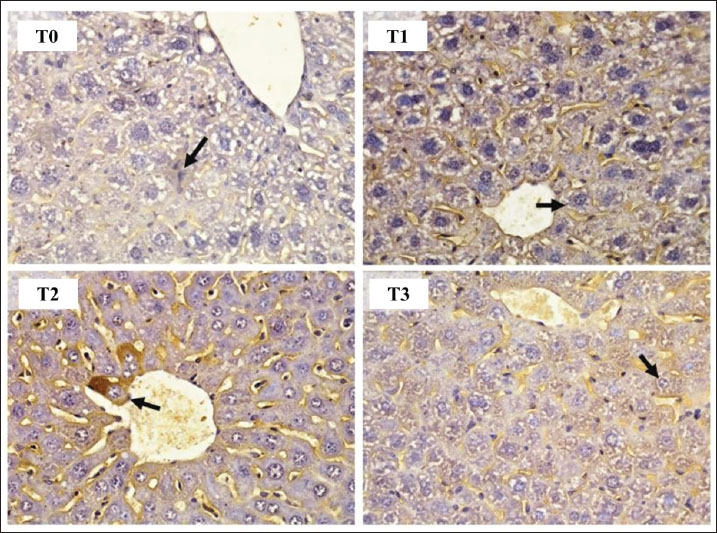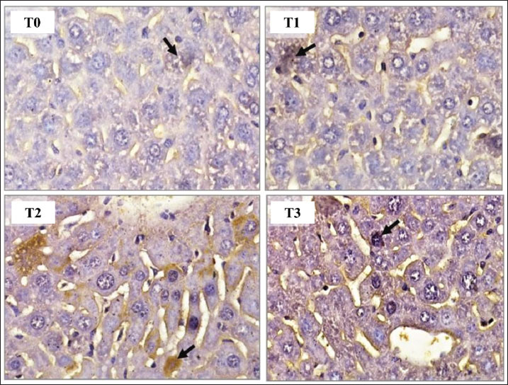 Fig. 1. AKT1 expression in hepatocytes of mice (Mus musculus) after capsaicin administration (0.3 mg/0.5 ml) and AFB1 induction (0.1 mg/0.5 ml). Immunohistochemistry staining with 400X magnification; Nikon H600L microscope; DS Fi2 300 megapixel camera.
