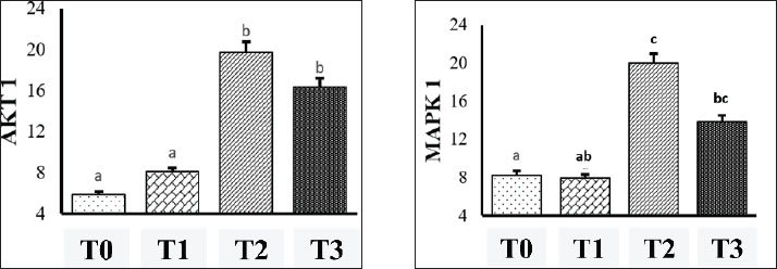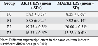 Fig. 3. AKT1 expression in hepatocytes of mice (Mus musculus) after capsaicin administration (0.3 mg/0.5 ml) and AFB1 induction (0.1 mg/0.5 ml). Immunohistochemistry staining with 400X magnification; Nikon H600L microscope; DS Fi2 300 megapixel camera. The mean IRS scores for AKT1 expression were as follows: P0 (5.83 ± 0.37), P1 (8.08 ± 0.25), P2 (19.75 ± 0.56), and P3 (16.33 ± 0.69). Statistical analysis using the Kruskal-Wallis test followed by post hoc Z-tests revealed significant differences: P2 versus P0 (p < 0.001), P2 versus P1 (p < 0.001), and P3 versus P1 (p < 0.01). Although the difference between P2 and P3 was not statistically significant (p=0.067), a significant reduction in AKT1 expression was observed in P3 (Table 3). The P1 group also exhibited significantly lower AKT1 expression than the P2 and P3 groups. However, AKT1 expression was not significantly different between P2 and P3, indicating that capsaicin was not statistically effective in suppressing AFB1-induced AKT1 expression. Nevertheless, a descriptive reduction in AKT1 levels was observed in the P3 group compared with the P2 group. Table 3. Mean IRS scores of AKT1 and MAPK1 expression (mean ± SD).
