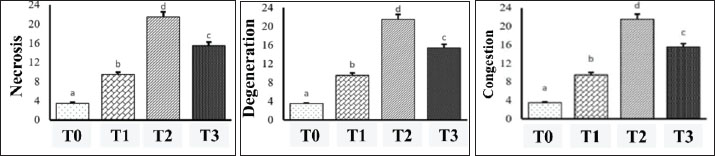 Fig. 5. Mean ± rank error diagram of observations of necrosis, degeneration, and congestion of hepatocytes in mice (Mus musculus) with statistically significant differences between groups. Observation of hepatic injury values are expressed as ranked mean ± standard mean. Values are statistically represented as a, b, c, when compared with group P0; p < 0.05 compared with group P2 AFB1. Observation of hepatic injury values are expressed as ranked mean ± standard mean. Values are statistically represented a, b, c, when compared with group P0; p < 0.05 compared with group P2 (AFB1). In this study, congestive hepatic injury was assessed in mean rank. The values are statistically represented a, b, and c when compared between groups with p < 0.05. In the variables of necrosis, degeneration, and congestion, group P3 (CAP + AFB1=15.50; 15.42; 15.50) had a significant decrease in score compared with group P2 (AFB1=21.50; 21.50; 21.50) and was significantly different from group P3 (CAP + AFB1) and P1 (CAP) and P0 (control). This shows a significant decrease in number compared to groups P0 (control), P1 (CAP), and P3 (CAP + AFB1) (Fig. 5). The target of the reading is to change the histopathological picture of hepatocytes, namely, degeneration, congestion, and necrosis. The data results are processed with SPSS 21.0 assuming normal data distribution or non-homogeneous data variance, and then the Kruskal-Wallis nonparametric statistical test is carried out, which is identical to the one-way ANOVA test (if in the parametric test). After being transformed, if the data distribution is still not normal or not the same (assumption), then a different test is carried out using the Kruskal-Wallis nonparametric statistic, if p ≤ 0.05 is obtained, the post hoc test (Z test) is continued, while if using the Mann–Whitney test, the researcher presents it in the appendix. If p < 0.05, then there is a significant difference, and vice versa. DiscussionExamination of the protective effect of capsaicin on AKT1 and MAPK1 expression in mouse livers using the IHC methodThis study investigated the hepatoprotective potential of capsaicin against AFB1 toxicity, focusing on its effect on the expression of AKT1 and MAPK1 target proteins using IHC analysis. Aflatoxin, a mycotoxin widely found in food and feed, poses a significant food safety concern because of its high toxicity and widespread occurrence. It contributes substantially to the incidence of aflatoxicosis (Benkerroum, 2020). These toxicological concerns underscore the need for curative or preventive strategies and regulations regarding its presence in consumables. Although aflatoxins are primarily known for their carcinogenic potential, AFB1 has also been implicated in various acute and chronic health disorders. AFB1 undergoes biotransformation to AFB1-8,9-epoxide via cytochrome P450 enzymes upon entry into the liver (De-Sá-Júnior et al., 2013). This epoxide metabolite is considered the primary agent of AFB1’s genotoxicity (Marchese et al., 2018). Furthermore, AFB1-induced oxidative stress plays a critical role in its toxicological mechanisms (Benkerroum, 2020). Immunoreactive score evaluation revealed AKT1 and MAPK1 expression levels in each treatment group. Statistical analysis using the Kruskal-Wallis test indicated that capsaicin did not significantly reduce AKT1 expression in the AFB1-induced groups. However, descriptive analysis using the Mann–Whitney test showed a decrease in both AKT1 and MAPK1 expression following capsaicin treatment in AFB1-induced samples. Specifically, capsaicin treatment significantly inhibited MAPK1 expression, as MAPK1 levels in the AFB1+capsaicin group were comparable to those in the capsaicin-only group. Meanwhile, AKT1 expression showed a downward trend, though not statistically significant, indicating a possible inhibitory effect of capsaicin requiring dose optimization. These observations support the concept of a dose-response relationship, as discussed by Sukmanadi et al. (2020), where the toxicological impact is proportional to the level of exposure to mycotoxins. Thus, capsaicin and AFB1 concentrations may influence the observed protein expression patterns. Capsaicin binds to 14 amino acid residues of AKT1, with 4 forming hydrogen bonds, whereas AFB1 interacts with 13 residues without hydrogen bonding. For MAPK1, capsaicin forms a hydrogen bond with 1 of the 15 involved residues, whereas AFB1 interacts with 7 residues, each forming a single hydrogen bond. According to Sukmanadi and Effendi (2021a), capsaicin and AFB1 overlapping binding residues indicate competition at the same binding sites, potentially leading to mutual inhibition effects. Capsaicin (8-methyl-N-vanillyl-6-nonenamide), a bioactive compound found in chili peppers, inhibits the metabolic activation of carcinogens, such as 4-(methylnitrosamino)-1-(3-pyridyl)-1-butanone, by microsomal enzymes and block α-hydroxylation (Anandakumar et al., 2012). These effects indicate that capsaicin may possess antimutagenic and anticarcinogenic properties by modulating xenobiotic-metabolizing enzymes (Singh et al., 1996; Fattori et al., 2016). AFB1 is predicted to form stable molecular complexes with AKT1 and MAPK1, triggering hepatotoxicity. Capsaicin may competitively inhibit the binding of AFB1 to these proteins, particularly AKT1, thereby preventing the activation of oncogenic signaling pathways (Marchese et al., 2018). MAPK1, also a member of the kinase family involved in liver cell function, was similarly affected, supporting the dual target hypothesis (Sukmanadi et al., 2020). Further analysis confirmed that AKT1 and MAPK1 are likely key capsaicin targets in inhibiting AFB1-induced hepatotoxicity. Amino acid residue similarity in capsaicin’s interactions with both proteins indicates overlapping or proximal binding sites, which may lead to similar receptor modulation (Sukmanadi et al., 2020). Additionally, potential activity scoring indicated high hepatoprot