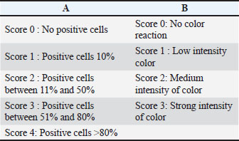 Data analysisImmunohistochemical data for AKT1 and MAPK1 (ERK) expression were assessed using the modified Remmele scoring system (Novak et al., 2007). The Remmele Index, also known as the IRS, is calculated by multiplying the score representing the percentage of immunoreactive cells by the staining intensity score. The IRS value for each sample was determined as the average of scores observed across five microscopic fields at 400x magnification. In addition to protein expression analysis, changes in liver histopathology—including signs of congestion, cellular degeneration, and necrosis—were also evaluated. The quantified expression levels of AKT1 and MAPK1, along with histopathological observations, served as key indicators in this assessment. The resulting data were analyzed using the IBM SPSS Statistics software version 21.0. If the data showed a normal distribution, parametric statistical tests were applied. Non-parametric tests were used in cases where the data remained non-normally distributed even after transformation. Specifically, the Kruskal-Wallis test was used to assess differences among groups. If the analysis yielded a significance level of p ≤ 0.05, a post hoc Z test followed. Alternatively, when comparisons involved only two groups, the Mann–Whitney U test was used, and detailed results from this test were provided in the appendix. A p-value below 0.05 indicated a statistically significant difference, whereas values above this threshold were considered insignificant. Ethical approvalThe Research Ethics Committee of the Faculty of Veterinary Medicine, Airlangga University, Animal Care and Use Committee approved this research (approval number: 1.KE.199.12.2019). ResultsExamination of the protective effect of capsaicin on the liver of mice using immunohistochemistryThe immunohistochemical analysis aimed to evaluate the expression levels of AKT1 (Fig. 1) and MAPK1/ERK (Fig. 2) in hepatocytes of Mus musculus (mice). Protein expression was assessed using the modified Remmele method (Novak et al., 2007), which calculates the IRS by multiplying the staining intensity by the percentage of immunoreactive cells. Averaging observations from five high-power fields (400× magnification) determined the IRS for each sample.