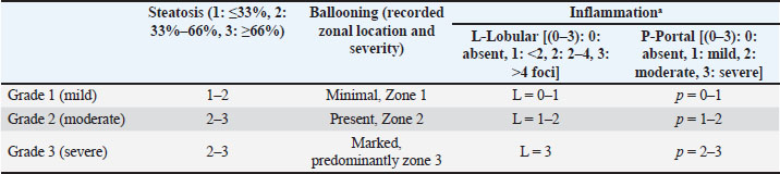 Histopathology preparation with Hematoxylin eosin stainingThe mouse liver was cut to a thickness of ±3 mm, inserted into a tissue cassette, and then inserted into an automatic tissue processor for dehydration, clearing, and infiltration. The dehydration process involves successively soaking the organs in 70%, 80%, 90%, and 96% ethanol, absolute ethanol I, absolute ethanol II, and absolute ethanol III, respectively. Furthermore, the clearing process involves soaking the organs in xylene I and xylene II solutions, and the infiltration process involves soaking the organs in paraffin I and paraffin II at 58°C for 2 hours. The organs were inserted into molds containing liquid paraffin using a paraffin embedding console and allowed to harden to form paraffin blocks. The organs in the paraffin were then cut using a microtome with a thickness of 3 µm. The thin ribbon cut results are placed on water in a water bath at a temperature of 45°C to remove folds. Furthermore, the preparation was lifted from the surface of the water with an object glass that had been reviewed with albumin solution and then dried overnight in an incubator at a temperature of 60°C. Next, the preparation underwent a deparaffinization and rehydration process by soaking it in xylene twice for 2 minutes, then rehydrating it using graded ethanol (absolute III, absolute II, absolute I, 96%, 80%) for 2 minutes each, then washing it with running water for 1 minute and drying it. The preparation was soaked in Mayer’s hematoxylin dye for 8 minutes, rinsed with running water, washed with lithium carbonate for 15–30 seconds, and rinsed again with running water. Then, the preparation was dipped in eosin dye for 2 minutes, rinsed with water for 30–60 seconds, dipped in 90% ethanol 10 times, absolute ethanol I 10 times, absolute ethanol II for 2 min, xylene I for 1 minute, and xylene II for 2 minutes. Next, the preparation was dried, dripped with entella, and covered with a cover glass. The histopathology of the liver examined was liver cell damage (hepatocytes) due to toxins (aflatoxin B1), characterized by hepatic injury resulting in changes in function and structure that were seen in microscopic observations with HE staining using 400x magnification, namely degeneration, congestion, and necrosis. Microscopic hepatic injury data were used to obtain congestion, degeneration, and necrosis scores using the modified Brunt system method by Brunt in Merat et al. (2010). Degeneration: Liver damage by toxic or immunological disorders causes hepatocytes to swell; congestion: Capillary dilation due to vasodilator stimulation, so that the vascularization of the injured location widens and contains blocked blood; necrosis: Tissue death, characterized by the presence of a dead core, is an advanced level of degeneration (Table 2). Table 2. The Brunt method hepatic injury score.