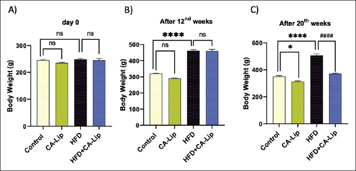 Fig. 2. Effect of CA-Lip on the body weight in HFD-fed rats. Data are presented as the mean ± SEM (n=10). ****p < 0.0001, *p < 0.05, ####p < 0.0001 versus HFD group, ns indicates nonsignificant. CA-Lip modulates changes in serum levels of lipid profile in HFD-fed ratsRats fed an HFT showed a notable increase in serum TC, TG, very low-density lipoprotein (VLDL-C), and LDL-C levels by 41%, 45%, 82%, and 92%, respectively, and a significant decrease in high-density lipoprotein (HDL) levels by 44% in comparison to the control group. CA-Lip injection induced a significant decline in TC, TG, VLDL-C, and LDL-C levels by 22%, 21%, 22%, and 34%, and an elevation in HDL by 51% in CA-Lip-fed HFD rats versus the HFD group. Serum levels of lipid profile were insignificantly different in the CA-Lip group compared to the control rats (Fig. 3A–E).