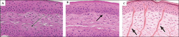 Fig. 1. H&E staining of the tail skin sections of BALB/c mice showing structural differences between the control (A), cold-stimulated (B), and heat-stimulated (C) groups. Arrows point to the dermal NFs. Scale bar=100 µm. Silver staining further demonstrated changes in NF density across groups. Silver-stained fibers were sparse and loosely arranged in the dermis of control mice (Fig. 2A). In contrast, both cold and heat exposure led to a marked increase in small, darkly stained NFs. The cold-stimulated group showed dense, fine networks near the dermal-epidermal junction (Fig. 2B), whereas the heat-stimulated group had thicker, clustered fibers throughout the dermis (Fig. 2C).