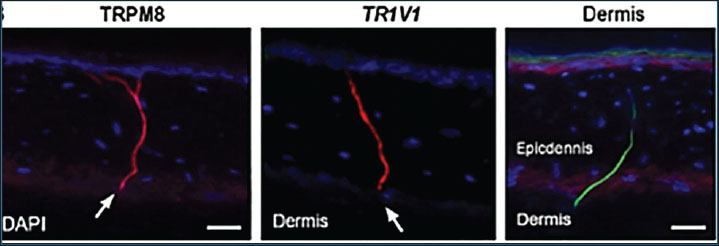 Fig. 3. Immunofluorescence images showing TRPM8 (green) and TRPV1 (red) expression in the tail skin across the control, cold-stimulated, and heat-stimulated groups. Nuclei were stained with DAPI (blue). Increased receptor signals are visible in tissues treated thermally. Scale bar=50 μm. Quantification of mRNA expression of TRPM8 and TRPV1Gene expression was measured using RT-qPCR. Fold change was calculated by comparing gene expression in the stimulated groups to that in the control animals using the 2−ΔΔCt method. Cold stimulation increased TRPM8 mRNA to approximately 5.8-fold above the control. Heat stimulation caused a 5.5-fold increase in TRPV1 mRNA levels. TRPM8 expression showed only a minor increase after heat stimulation, whereas TRPV1 expression remained near baseline in cold-treated mice. These changes were statistically significant (Fig. 4A).