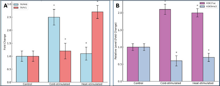 Fig. 4. Expression of temperature receptors (TRPM8 and TRPV1) and histone modification genetic markers in the dorsal tail skin of BALB/c mice. Both cold and heat stimulation led to epigenetic changes in the hypothalamic neurons. Histone acetylation levels increased, with higher H3K27ac levels detected in both groups. This marker indicates transcriptional activation. H3K9me3, associated with gene repression, was reduced (Fig. 4B). Changes in nerve density after cold and heat stimulationQuantification of NFs showed clear changes after exposure to both cold and heat. Cold stimulation increased the TRPM8-positive nerve density from 0.6 to approximately 1.2 nerves/mm². Heat stimulation also increased the nerve density, reaching approximately 1.4 nerves/mm² for TRPV1-positive fibers. The diameter of NFs increased significantly in both cases (Fig. 5).