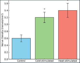 Fig. 5. Nerve density in mouse tail skin illustrating the relative density of NFs in the dorsal tail skin of BALB/c mice. Neuropeptide levels following cold or heat stimulationSubstance P and β-Endorphin showed significant increases (p < 0.05) in both stimulated groups compared with the baseline levels of both peptides (Fig. 6).
