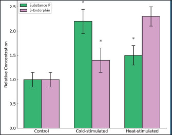 Fig. 6. Analysis of neuropeptides showing the relative concentrations of substance P and β-Endorphin in tail skin tissue of BALB/c mice. Neuropeptide levels were measured using HPLC. DiscussionThe hypothalamus integrates various sensory inputs to maintain body homeostasis. Its complex network of nuclei regulates not only thermoregulation but also endocrine, metabolic, and behavioral functions (Langlois et al., 2022). The observed histological changes in mouse tail skin highlight how peripheral sensory inputs activate these central hypothalamic circuits. The increased expression of TRPM8 and TRPV1 after cold and heat stimulation, respectively, reflects the dynamic responsiveness of cutaneous thermoreceptors (Panula, 2021). Aging influences hormonal sensitivity and receptor activity, potentially altering these thermosensory pathways as animals mature (Hill et al., 2020). Thermal stimulation induces measurable changes in peripheral nerve density in the mouse tail. Cold exposure significantly increased TRPM8-positive NFs, whereas heat exposure enhanced TRPV1-related nerve profiles. These structural alterations included nerve number and diameter expansion, indicating adaptive remodeling of the cutaneous sensory network. The sensory system responds to repeated environmental stimuli by reinforcing its structural presence. This remodeling supports the hypothesis that thermal cues enhance peripheral sensitivity. Increased nerve density may intensify sensory signal transmission toward central structures, facilitating rapid temperature regulation (Winter et al., 2017). Strong transcriptional responses supported these anatomical changes. TRPM8 mRNA expression increased sharply after cold stimulation, while TRPV1 mRNA increased after heat exposure. These fold changes were calculated using the 2−ΔΔCt method, confirming significant transcriptional upregulation. This pattern mirrors the findings on nerve density and confirms that receptor gene activity is tightly linked with local neuronal expansion. These results demonstrate that cold and heat activate specific transcriptional programs in thermosensory neurons. We interpret this coordinated structural and genetic response as an integrated adaptation mechanism. It strengthens the receptor system against future thermal stress, helping the organism maintain homeostasis (AlGonzález-Montelongo et al., 2016; Reimúndez et al., 2018). Thermal stimulation also induced epigenetic changes in the hypothalamic regions at the molecular level. Both cold and heat treatment significantly elevated H3K27ac levels and suppressed H3K9me3 expression. These changes demonstrate that chromatin relaxation and transcriptional activation occur in the central sensory processing centers. The hypothalamus, which is known for its regulatory role in temperature and homeostasis, appears to undergo dynamic remodeling in response to peripheral stimulation. This confirms previous hypothalamic models that adjust their structure and function to external demands (Alatzoglou et al., 2020; Cheon et al., 2025). These histone changes may serve as early regulatory mechanisms, preparing neurons for enhanced sensory processing-related gene transcription. Neuropeptide analysis provided further evidence of the central involvement of the tumor. Substance P and β-Endorphin levels increased significantly after thermal exposure. Cold stimulation led to the strongest increase in Substance P, while β-Endorphin was more elevated in the heat group. These findings support the notion that both cold and heat influence neurochemical output. Elevated neuropeptide levels confirm that thermal stimulation affects not only local sensory pathways but also brain circuits responsible for peptide release. The hypothalamus and pituitary are likely involved in coordinating these responses. Similar peptide shifts occur in stress-related conditions such as ectopic Cushing’s syndrome (Ragnarsson et al., 2024), where ACTH levels alter downstream hormonal systems. Although CRH and ACTH were not measured in this study, earlier models suggest that thermal cues could indirectly influence these axes. Kisspeptin is one such example; it links energy balance and reproductive signaling (Navarro, 2020). The observed peptide changes may reflect a wider neuroendocrine response, possibly involving pathways beyond thermoregulation. The hypothalamus, especially paraventricular and lateral zones, modulates respiratory and autonomic functions in response to sensory input (Fukushi et al., 2019). Microglial activity in these zones can also affect synaptic reorganization, thereby influencing both sensory and hormonal responses (Fang et al., 2023). The findings of this study support the hypothesis that thermal stimuli activate a broad set of sensory and regulatory pathways that help the brain adapt to environmental changes. Such pathways may be targeted in the future through pharmacological tools, such as agents that affect the release of growth hormones (Sigalos and Pastuszak, 2018). ConclusionThis study confirmed that TRPM8 and TRPV1 respond strongly to cold and heat in the tail skin of mice with BALB/c. Both histological and molecular analyses revealed clear nerve activation and gene changes. AcknowledgmentThe authors thank the College of Veterinary Medicine, University of Al-Qadisiyah, for their support in this study. Conflict of interestThe authors declare no conflicts of interest. FundingThe authors self-funded the study. No external funding source is available. Authors’ contributionsAll authors participated in the study. Data availabilityData are available when requested by the corresponding author. ReferencesAdamantidis, A.R. and De Lecea, L. 2023. Sleep and the hypothalamus. Science 382(6669), 405–412; doi:10.1126/science.adh8285 Alatzoglou, K.S., Gregory, L.C. and Dattani, M.T. 2020. Development of the pituitary gland. Compreh. Physiol. 10(2), 389–413; doi:10.1002/cphy.c150043 Andrè, E., Campi, B., Materazzi, S., Trevis