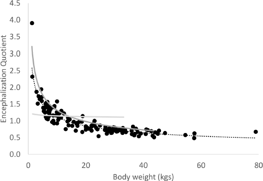 Fig. 2. Encephalization quotient decreases with increasing body weight in dogs. The dashed black line represents the regression line for dogs, the dark gray solid line represents the regression line for dogs from the Richet dataset, and the light gray solid line represents the regression line for canids from the Gittleman dataset. The regression line for canids crosses the regression lines for dogs at approximately 10–15 kg. Are little dogs smarter than big dogs?No behavioral evidence exists that small breed dogs are more intelligent than large breed dogs. Indeed, common wisdom suggests the opposite—that small breeds are less “trainable,” less sociable, and less smart than large breed dogs (Helton, 2010; Helton and Helton, 2010; Jakovcevic et al., 2010). One study suggested that large breeds demonstrated higher social cognition scores than small breeds, based on a visual pointing cue test (Helton and Helton, 2010). A more recent study supported this observation (Horschler et al., 2019), but another investigator challenged the methodology of this study (Montgomery, 2019). Furthermore, other investigators failed to observe a relationship between brain size and cognition (Broadway et al., 2017). On the other hand, researchers identified a spectrum of cognitive abilities in a single working breed (Arden and Adams, 2016). Many of the differences identified in these cognitive studies might simply be identifying selection of specific morphotypes for specific tasks, and certain cognitive skills that underpin those tasks, rather than selecting for or against overall intelligence. Such a hypothesis finds support in studies that identify “trainability” with working breeds vs. non-working breeds (Mehrkam and Wynne, 2014; Eken Asp et al., 2015), rather than size. Given that working breeds are generally larger than non-working breeds, size might simply be a poor surrogate for “working breed.” This observation also flies in the face of assigning an encephalization quotient to dogs—in our study, small breed dogs had a relative brain size far exceeding their “expected” brain size, while large and giant breed dogs had relative brain sizes of mental midgets. Therefore, applying an encephalization quotient to dog breeds appears nonsensical, and challenges the entire anthropocentric notion of encephalization as a measure of intelligence. What is the appropriate encephalization quotient for domestic dogs?Assigning a single encephalization quotient to Canis canis (Canis familiaris) seems similarly problematic—which quotient (from 4.0 to 0.5) would be most appropriate? Creating an “average” encephalization quotient depends on the sample population from which the average is obtained, and is, therefore, prone to error. Others have suggested that the domestic dog has an encephalization quotient that is substantially lower than wolves, arguing that domestication has led to a decrease in “intelligence.” However, such claims are based on examining dogs that had a weight similar to that of wolves (30 kg). One way to approach this question is to examine the intersection of the curves for domestic dogs and all canids. These lines cross at a weight of approximately 10 kg. Could this intersection be considered the “prototypical weight” of the original, domesticated dog? Examination of stray dogs in areas where little or no breed selection pressure exists, suggests that this might indeed be a reasonable estimate for prototypical dogs, which some have estimated to weigh between 9 and 15 kg (Coppinger and Coppinger, 2001). These dogs are generally reasonably small and thin (importantly, they are not overweight or obese). From our data, dogs ranging from 9 to 11 kg had an average encephalization quotient of 1.2. This would be no different from the encephalization of other canids, including the wolf and fox. What makes a dog a dog?Our data, and those of Richet, provide some interesting limits to brain size (Richet, 1891). Dogs as small as 1.3 kg have brains that are approximately 40–50 g, while dogs 30–40 times that size have brains that rarely exceed 110 g. This relatively small increase in brain size, and an absolute apparent lower limit, which is considerably greater than comparably sized mammals of other species, suggests that, regardless of how small domestic dogs become, brain size must be conserved to accommodate sufficient neuronal complexity for the dog to maintain its “dogness.” Similarly, because large and giant-breed dogs do not behave or socialize differently from small breed dogs, they do not require additional cognitive functions. Does a lower brain limit result in developmental problems in small dogs?If absolute brain size is limited in dogs, attempting to reduce body size could have clinical consequences. Open fontanelles, where cranial growth plates on top of the skull fail to close, are almost exclusively seen in toy and miniature breeds. These breeds have relative macrocrania, often with a domed large skull and a relatively small face. These breeds are also predisposed to hydrocephaly. Such cranial phenotypes might result from attempting to fit a brain required for a dog to maintain its “dogness” into an ever-shrinking canine head. ConclusionOur data confirm the observations made over 130 years ago by Richet, and the subsequent analysis of Richet’s data by Lapicque. However, our data suggest that the dogs of the 21st century are heavier (fatter) than their counterparts from a century ago. Finally, our data suggest that the theory of encephalization does not apply within species, and is largely constant within a genus if an appropriate representative weight is selected. Supplemental dataThe full dataset can be obtained at this link (https://www.openveterinaryjournal.com/brain-volumes-ovj-2021). Conflict of interestThe authors have no conflicts of interest to declare. Author contributionsMark Rishniw conceived of the study, analyzed the data, and drafted the m