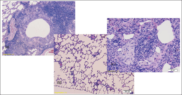 Figure 2b shows the second degree of types of changes, which is manifested through minimal and multifocal changes with minimal damage to individual cardiomyocytes. The usual structuring of the sarcoplasm, in which the network connection of individual cardiomyocytes is presented, is present. Blood vessels are lined with endothelial cells whose nuclei are large and darker in color. Figure 2c and d) shows the myocardium of rats from the experimental group that was exposed to a water temperature of 44˚C until death (heat stroke-44), where the development of extensive changes through greater focal extensive damage to cardiomyocytes is also analyzed, which is also the largest extensive change that occurred in our research. We monitored the degenerative changes, including the loss of the usual structure of the sarcoplasm, which does not show the individual cardiomyocytes’ network connection. Areas of myofibrillar degeneration are presented as brighter zones of the myocardium in which cardiomyocytes have a lower affinity for colors. Nuclei are of altered shape and position, pyknotic, and nucleoli stand out only in certain cardiomyocytes. Blood vessels are lined with endothelial cells whose nuclei are large and darker in color. Morphological-descriptive analysis of rat lung tissueThe lungs of all examined rats showed signs of acute bronchitis and bronchiolitis along with initial bronchopneumonia (Fig. 3 a). Focal acute emphysema (Fig. 3 b) and focal clusters of foamy macrophages (Fig. 3 c) were also observed.