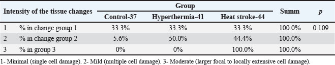 Analyzing the type of changes in the experimental groups, similar types of changes were observed depending on the experimental groups. Analyzing the extent of the changes, damage to individual cardiomyocytes and gentle damage to individual cardiomyocytes in the Hyperthermia-41 and Heat stroke-44 groups were observed, with sometimes greater focal damage to cardiomyocytes in the Heat stroke-44 group changes, while the other groups (Hyperthermia-41, Heat stroke-44) developed minimal and multifocal degenerative changes, sometimes with mineralization (Table 4). Table 4. Pathological type of changes.