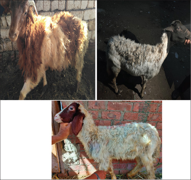 Fig. 1. Sheep suffering from unthriftiness. In the current study, the sheep had alopecia, which was dispersed across the body, including the lumbar area, axillae, fatty tail, and both sides of the neck. In most cases, the coat was rough, the black or brown wool was steely, and the wool was easily removed and displayed depigmentation or discoloration. Alopecia and wool eating have been observed in Zn-deficient animals (Nelson et al., 1985), whereas White (2004) reported poor wool growth and improper keratinization of wool fibers in Zn-deficient sheep. Additionally, our serum Zn results were consistent with those of Bires et al. (1991), El-Sangary (1999), and Nelson et al. (1985). Zn deficiency is linked to decreased growth rate, decreased reproductive performance, poor immune responses, and skin infections (El-Attar, 1979; Chan et al., 1998; Gooneratne et al., 1989; Mozaffari and Derakhshanfar, 2007). Harold et al. (2011) also reported that Zn, as a trace element, plays an important role in numerous enzymatic reactions. A correlation exists between Zn deficiency and alopecia. Hefnawy et al. (2018) found that the skin contains a higher amount of Zn, particularly in the epidermis, than in the dermis, which is necessary for epidermal cell proliferation and differentiation. Watson (1998) noted that Zn plays a role in the immune system and vitamin A metabolism, which may result in a decreased serum vitamin A level in cases of Zn insufficiency. In addition, we found a significant decrease in serum Zn and Cu levels as well as a significant decrease in serum vitamin A levels in patients with noninfectious skin infections. The link between vit A metabolism and Zn metalloenzymes are necessary for the conversion of retinol to vit. Aldehyde (Underwood and Shuttle, 2000). According to Berger (2002), Zn is present in approximately 300 enzyme components. Alopecia, crusting, and scaling are symptoms of Zn insufficiency. Zn promotes wound healing, keratin synthesis, epidermal cell proliferation, and cellular integrity. Epidermal keratinocytes proliferate and differentiate (Ogawa et al., 2016). The symptoms we noticed in our survey were matched with those recorded by Kendall et al. (2000) as parakeratosis, wrinkled skin, wool loss, and alopecia.