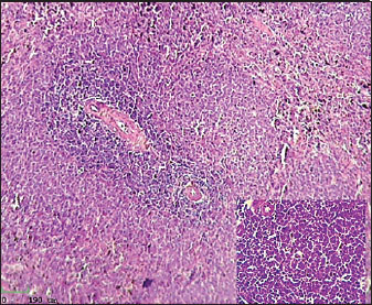 Fig. 4. Histological section of male rat spleen treated with L-arginine, stained with Hematoxylin and Eosin (H&E), showing villus structure at 10x magnification using light microscopy. DiscussionThis study investigated the effects of chronic L-arginine administration on inflammatory responses, hematological indices, physiological parameters, and histological changes of intestine and spleen in a rat model of enteritis. The results demonstrate that L-arginine induces significant intestinal inflammation, characterized by alterations in body weight, blood parameters, inflammatory biomarkers, and tissue morphology. The significant reduction in body weight and weight gain observed in the enteritis group aligns with previous findings that chronic inflammation and intestinal damage impair nutrient absorption and metabolism, leading to weight loss (Ebohon et al., 2020). Weight fluctuations act as a precise sign of overall health and the intensity of the inflammatory response. Haematological study indicated anemia-like characteristics in L-arginine-treated rats, evidenced by reduced RBC count, haemoglobin concentration, packed cell volume, and RBC indices. These alterations are likely attributable to inflammatory enteritis impacting erythropoiesis and perhaps leading to increased red blood cell destruction or loss (Weiss et al., 2019). IL-6 also controls iron and zinc levels by inducing hepcidin and zinc transporters, leading to anemia and hypozincemia in chronic inflammation (Nemeth et al., 2004; Liuzzi et al., 2005). In bone marrow, IL-6 promotes platelet production (Ishibashi et al., 1989). Neutrophils and monocytes play an important role in intestinal inflammation as they are actively recruited to inflamed tissue, where they help the immune system as well as the inflammatory response. Neutrophils maintain gut health by discarding bacteria that penetrate the epithelial barrier. Nevertheless, they perhaps exacerbate inflammation by the release of cytokines as well as reactive oxygen species (Kang et al., 2022). Monocytes differentiate to macrophages and dendritic cells, changing immune system physiology in mucous membranes and exacerbating chronic inflammation in circumstances such as inflammatory bowel disease (Liao et al., 2024; Lu et al., 2024; Long et al., 2024). Basophils show distinct function in the context of allergic inflammation that result in increased therapeutic potency, basophils can be recruited to sites of inflammation where they release histamine, cytokines, and other mediators that amplify immune responses (Siracusa et al., 2013). A significant decrease in basophil percentages, as observed in our enteritis model, might reflect their migration from the bloodstream into inflamed tissues, leading to peripheral blood basopenia. The observed non-significant changes in eosinophil counts, despite notable alterations in other white blood cell populations, likely reflect the specific immunopathological features of L-arginine-induced enteritis. This enteritis model may engage distinct immune regulatory pathways that predominantly recruit neutrophils and monocytes, unlike other chronic inflammatory models where basophils and eosinophils are actively involved. This differential recruitment could be due to the particular cytokine milieu or tissue microenvironment induced by L-arginine, which favours neutrophil- and monocyte-mediated responses over eosinophil or basophil activation. Further mechanistic studies would be needed to elucidate these immunoregulatory distinctions fully. Markers of serum inflammatory such as TNF-α, IL-6, and CRP were significantly increased, consistent with their established roles as mediators and biomarkers of intestinal inflammation (Neurath, 2014). The key role of cytokines is also highlighted by the fact that blockade of tumour necrosis factor is commonly used as a standard therapy for intestine bowel disease in the clinic (Danese and Fiocchi, 2011). In pathological conditions such as IBD, elevated TNF-α contributes to epithelial barrier dysfunction and tissue injury, making it a prime therapeutic target (Neurath, 2014). Thus, TNF-α is a key pro-inflammatory cytokine produced primarily by activated macrophages and plays a central role in initiating and sustaining the inflammatory cascade within the intestinal mucosa. It promotes leukocyte recruitment, activates endothelial cells, and induces the production of other cytokines and chemokines, thereby amplifying the immune response. IL-6 plays a central role in inflammation and immunity. Produced early at inflammation sites, it triggers the liver to produce acute phase proteins like CRP and serum amyloid A, while reducing others such as albumin (Heinrich et al., 1990). Prolonged high levels of serum amyloid A can cause amyloidosis, damaging organs (Gillmore et al., 2001). Thus, IL-6 is a pleiotropic cytokine involved in the acute phase response and regulation of immune cell differentiation and survival. Persistent elevation of IL-6 correlates with disease severity and progression in intestinal inflammatory disorders. C-reactive protein is a homopentameric acute-phase inflammatory protein that shows elevated expression through inflammatory cases such as some cardiovascular diseases, rheumatoid arthritis, and infection. There is evidence that CRP does more than just show when there is inflammation or an infection. It also plays a big part in controlling inflammatory processes. The main parts of inflammation and the body's reaction to infection that CRP helps with are the complement pathway, apoptosis, phagocytosis, release of nitric oxide, and production of cytokines (Sproston and Ashworth, 2018). Thus, CRP not only shows that the body is inflamed, but it also helps the body's defence system by encouraging complement activation and the opsonisation of germs and damaged cells. The amounts show how bad the inflammation is and can be used to predict how well a treatment will work for intestinal inflammation. Since t
