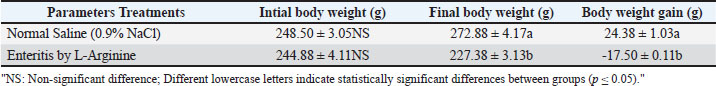 AbstractBackground: Enteritis is an inflammatory disorder of the intestine characterised by complex immunological responses and subsequent tissue destruction. L-arginine, a semi-essential amino acid involved in nitric oxide generation, demonstrates both protective and pro-inflammatory actions in varying settings. Nonetheless, its involvement in enteritis production and related inflammatory responses is not yet fully understood. Aim: This research investigated the long-term impacts of L-arginine administration in rats with enteritis, focussing on proinflammatory cytokines, serum calprotectin, haematological parameters, physiological changes, and histological alterations. Methods: Male rats received an oral administration of 500 mg/kg of L-arginine daily for a duration of 30 days to induce enteritis. The control group of rats was administered saline. Body weight, blood tests, and serum levels of tumour necrosis factor-alpha (TNF-α), Interleukin-6 (IL-6), calprotectin, and C-reactive protein (CRP) were evaluated. The small intestine and spleen were histologically examined to see how much tissue inflammation there was. Results: The administration of L-arginine to rats led to a notable decrease in body weight and haematological indices, such as red blood cell count, haemoglobin concentration, and packed cell volume. Levels of inflammatory markers TNF-α, IL-6, CRP, and calprotectin were significantly higher in comparison to control groups. Histological analysis demonstrated vascular congestion and perivascular lymphocytic infiltration in the gastrointestinal tract, as well as lymphoid hyperplasia and blood vessel congestion in the spleen, which indicates active inflammation. Conclusion: Extended administration of L-arginine in rats induces enteritis, an inflammatory condition affecting both systemic and localised areas. Proinflammatory cytokines and calprotectin correlate with biochemical and histological markers of inflammation, indicating their utility as biomarkers for the diagnosis and monitoring of enteritis. The findings indicate that L-arginine supplementation should be avoided in contexts associated with intestinal inflammation and underscore potential avenues for therapeutic intervention. Keywords: Calprotectin, Cytokines, Enteritis, Rat Model, L-Arginine. IntroductionIntestinal inflammation represents a multifaceted pathological process associated with various gastrointestinal diseases, frequently influenced by dysregulated immune responses and excessive production of proinflammatory cytokines. Interleukin-6 (IL-6) is a key mediator cytokine of the immune response and a regulator of many physiological and pathological processes. Pro-inflammatory cytokines are generally upregulated in inflammatory bowel disease (IBD) including tumour necrosis factor-alpha (TNFα) and IL-6 (Alhendi and Naser, 2023). IL-6 was first discovered as a soluble factor secreted by helper T cells to induce production of antibody and release by B cells. It was originally termed B-cell stimulatory factor-2 or B-cell differentiation factor (Hirano et al., 1986). The cytokine tumor necrosis factor- alpha is an crucial molecule involved in intestinal inflammation and barrier dysfunction (Suenaert, 2002). TNF-a has showed to increase permeability of intestine in patients with IBD by increased expression of epithelial myosin light chain kinase (Su et al., 2013). The blockers targeting TNF-a have become an invaluable part of the therapeutic armamentarium in IBD (El Mourabet et al., 2010). Inflammation constitutes a fundamental pathogenic mechanism linked to various diseases. The body activates the immune system to initiate inflammatory responses upon encountering harmful agents, involving viruses, bacteria, toxic chemicals, or tissue injury. The responses entail intricate interactions between inflammatory cells and endothelial cells, which constitute the monolayer lining the interface between blood and tissues. Endothelial cells serve as primary targets for pathological stimuli and exhibit rapid responses to local alterations caused by inflammatory factors (Medzhitov, 2010). L-arginine (Arg) is a semi-essential amino acid produced from glutamine, glutamate, as well as proline through the cycle of urea, particularly via the intestinal-renal axis in mammals including rats. It plays a critical role in synthesis of protein and serves as nitric oxide synthase substrate to generate nitric oxide (NO), a key vascular protective molecule released by the endothelial cells (Wu et al., 2009). Because L-arginine has both good and bad effects on the body, its effects on intestinal inflammation are still not well understood. The goal of this study is to find out if serum calprotectin can be used as a reliable marker of intestinal inflammation in a rat model of L-arginine-induced enteritis. We also compare serum calprotectin levels to other known inflammatory markers, such as C-reactive protein (CRP), (TNF-α), and interleukin-6 (IL-6), as well as check other important physiological parameters. Materials and MethodsInduction of experimental enteritisAdult Wistar male rats, 2 months age, weighing 200–250 g, were obtained from animal house of College of Veterinary Medicine, University of Basrah, and housed under controlled laboratory conditions with a 12-hour light/dark cycle, with free access to food and water. The animals were allowed to acclimate for 15 days prior to the experiment. Rats were randomly divided into two groups: the experimental group (n=10), which received L-arginine, and the control group (n=10), which received normal saline. Enteritis was induced in the experimental group by oral administration of L-arginine dissolved in normal saline at a dose of 500 mg/kg body weight, given orally once daily for 30 consecutive days. The control group received an equivalent volume (1 ml) of physiological saline orally for the same duration. Assessment physiological parametersMeasurement of body weight and body weight gainThe bod