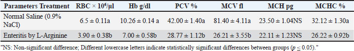 RBC counts and indicesAs presented in Table 2, the enteritis group showed a significant decrease (p ≤ 0.05) in red blood cell count, Hb, PCV, MCV, and MCHC relative to controls. Table 2. Mean of RBC counts and RBC indices between studied groups.
