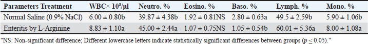 WBC counts and differentialsTable 3 indicates a significant increase (p ≤ 0.05) in total white blood cell count, neutrophils, monocytes, and lymphocytes in the enteritis group compared to the control group, whereas basophil percentages significantly decreased (p ≤ 0.05). Eosinophil levels showed no significant change (p > 0.05). Table 3. Mean of WBC counts and percentage of differential count of WBC between studied groups.