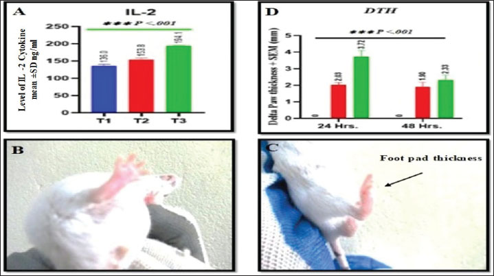 Fig. 1. Nanoparticles enhancing KWSPAgs- immunization would be more fit than using infection. Mice were exposed to a double dose of 0.5 ml KWSPAgs (IP) at 2-week intervals. On day 1, DDW as a VEH was administered to these mice (IP) in the control group and KWSPAgs alone and KWSPAgs +NPs on day 14. The mice were euthanized on day 28 for various studies. (A) IL2 cytokine level from serum obtained on day 28. (B and C) Compression between the clinical macroscopic changes between the naive and immunized groups. Five mice in each group were used, and the data were confirmed in three independent experiments. (D) Comparison of the foot pad thickness between the groups at 24 and 48 hours *p ≤ 0.05, p** ≤ 0.01, ***p ≤ 0.001. NPs increased the delivery efficacy of the group with NP, which increased the immunogenicity of KWSPAgs through the upregulation of both IgG and TLR2In this study, we further investigated the humoral immunity biomarkers after we noticed that there was an immune response after exposure of mice with IP injections of KWSPAgs and KWSPAgs + NPs. The results showed that both IgG and TLR2 were significantly increased after KWSPAgs compared with Naïve group suggesting the successful preparation of KWSPAgs, which was used in this study exclusively for inducing the immune response. At the same time, there was a further upregulation of both IgG and Toll-like receptors (TLR) in KWSPAg +NPs compared with KWSPAgs alone, suggesting the successful role of NPs in promoting the immunogenicity of KWSPAgs (Fig. 2A and B).