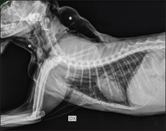 Fig. 1. Thoracic radiography (lateral view) performed upon patient arrival. Note the severe subcutaneous emphysema (white asterisk) in the head and neck region combined with moderate pneumomediastinum and mild pneumothorax.