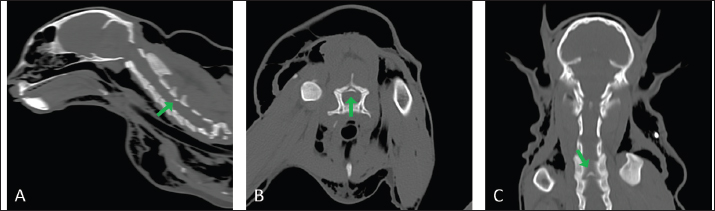Fig. 3. Longitudinal (A, C) and transverse (B) CT images acquired with the cat placed in the VetMouse TrapTM. Incomplete fracture line of the caudal margin of the fourth cervical vertebral arch (green arrow). The fragment is dislocated into the vertebral canal, narrowing the dorsoventral diameter with subsequent compression of the spinal cord. Table 1. Results of selected clinicopathological variables at blood gas analysis evaluated at different time points in the case described. T0=upon admission; T1=after surgery.