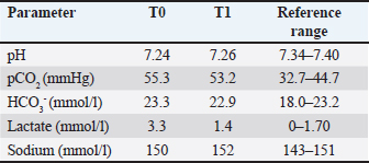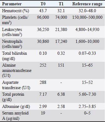 Table 2. Results of selected clinicopathological variables at complete blood count and serum biochemical profile evaluated at different time points in the case described. T0=Day 1, upon admission; T1=Day 3, postoperative.