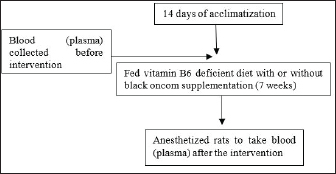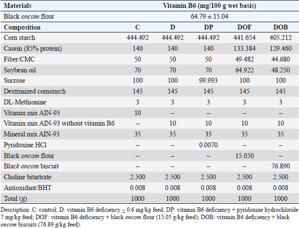 AbstractBackground: Black oncom biscuit contains contains vitamin B6 and that is a derivative product of black oncom (peanut meal fermented by Rhizopus oligosporus). Aim: This study analyzed the effect of black oncom subtitution (black oncom flour and black oncom biscuit) on body weight (BW), feed intake, growth rate, and vitamin B6 status in rats with vitamin B6 deficiency. Methods: Male rats were randomly selected into five groups and it respectively received five treatments which contained 3 g/kg feed of methionine, i.e., normal diet as control (C group), vitamin B6 deficient (≤ 0.6 mg/kg) diet (D group), vitamin B6 deficient (≤ 0.6 mg/kg) diet with pyridoxine HCl (7 mg/kg) substitution (DP), vitamin B6 deficient (≤ 0.6 mg/kg) diet with 15.05 g/kg feed of black oncom flour substitution (DOF), and vitamin B6 deficient (≤ 0.6 mg/kg) diet with 76.89 g/kg feed of black oncom biscuit substitution (DOB) for 7 weeks. Results: The BW, feed intake, and growth rate of the DOF and DOB groups were not different from those of the C group, whereas the D and feed intake were significantly reduced in the D group compared to the C group. Plasma pyridoxal 5’ phosphate levels were decreased in the D group, and increased in the DOF and DOB groups (p > 0.05). Plasma homocysteine was increased in the D and DOF groups, but decreased in the DOB group (p > 0.05). Conclusion: This study demonstrated the potential benefits of black oncom in maintaining BW, growth rate, and vitamin B6 status. Keywords: Black oncom biscuit, Black oncom flour, Body weight, Fermented peanut meal, Methionine, Vitamin B6 status. IntroductionVitamin B6 deficiency is a micronutrient deficiency problem that can be characterized by low vitamin B6 intake and low plasma levels of pyridoxal 5’ phosphate (PLP) in the blood < 30 nmol/l (suboptimal) or <20 nmol/l for severe deficiency (Tang et al., 2018). This condition still occurs in many countries, where the prevalence of vitamin B6 deficiency in adults reaches 10% (severe deficiency) and 17% (marginal deficiency), and as high as 37% in the elderly (Jungert and Neuhäuser-Berthold, 2020). Data from Indonesia shows that 58%–67% of Indonesians consume vitamin B6 foods below the recommended nutritional adequacy (Humayrah et al., 2019). Vitamin B6 deficiency can be caused by insufficient vitamin B6 intake, an unbalanced diet, not consuming supplements, or excessive supplement consumption, or metabolic disorders (Tang et al., 2018). Factors that can increase the risk of vitamin B6 deficiency include the elderly, use of drugs, alcohol consumption, and smoking (Jungert and Neuhäuser-Berthold, 2020). Comorbid conditions, such as type 2 diabetes, kidney transplantation, hemodialysis, inflammation, cancer, colorectal cancer, rheumatoid arthritis, and cardiovascular disease, can also increase the risk of vitamin B6 deficiency (Tang et al., 2018). The symptoms of vitamin B6 deficiency include weakness, difficulty sleeping, depression, dermatitis, cheilosis, glossitis, and stomatitis (Abosamak and Gupta, 2020). Vitamin B6 status can be directly determined by measuring PLP in the blood plasma (Ueland et al., 2015). PLP is the active form of vitamin B6 in the body and is used as a cofactor for various metabolic processes, such as carbohydrates, lipids, and proteins (Dalto and Matte, 2017). This disorder can reduce energy production and disrupt the growth process (Raposo-Blouw and S, 2015). Low PLP levels can trigger an increase in homocysteine (Hcy) levels in the blood, which is known as hyperhomocysteinemia (Kitagawa et al., 2015; Kitagawa et al., 2017). Increased Hcy levels can induce the pathogenesis of various diseases (Moretti and Caruso, 2019). This is supported by a prospective cohort study conducted by Zhao et al. (2018), in which a state of vitamin B6 deficiency in the long term can affect the development of various chronic diseases, including death (mortality). Vitamin B6 is present in many foods, both animal and plant foods. Vitamin B6 is mainly found in animal foods in the form of pyridoxal and pyridoxamine, whereas it is generally found in the form of pyridoxine in plant foods. Plant foods have lower bioavailability than animal foods because they contain dietary fiber components (EFSA NDA, 2016). Therefore, supplementation may protect against vitamin B6 deficiency. Several studies have shown the effect of vitamin B6 supplementation in maintaining vitamin B6 status, such as folic acid (Bajic et al., 2022), phosphatidyl choline (Kitagawa et al., 2015), choline, and betaine (Kitagawa et al., 2017). Vitamin B6 intake from food has a significant impact on vitamin B6 status (Mayengbam et al., 2016; Mayengbam et al., 2015). Vitamin B6 can be obtained from animal or plant foods. Previous studies have shown that fermented peanut meal by Rhizopus oligosporus (also known as black oncom) in West Java is a plant food with a vitamin B6 content of 2.32 mg/100 g bb (Rohimah, 2020). Black oncom biscuits (DOBs) have a vitamin B6 content of 13.09 mg/100 g (Rohimah et al., 2021a). Several studies have shown that fermented peanut meal has benefits in supporting growth, cognitive (Jiang et al., 2019), and hypolipidemic effects (Lu et al., 2021). Based on the potential benefits of fermented peanut meal, no research has examined the potential benefits of vitamin B6 content from black oncom on body weight (BW) and vitamin B6 status. Therefore, this study aimed to provide basic scientific evidence on the effects of black oncom and its processed products, that is black oncom flour and black oncom biscuits, on growth and vitamin B6 status (plasma PLP and Hcy) in experimental rats fed a vitamin B6-deficient diet. Materials and MethodsThis research began with the making of black oncom, black oncom flour, black oncom biscuits, rat feed, tested feed to rats as an animal model, and vitamin B6 status measurement. This research was conducted from November 2021 to July 2022 at the Food Development Laboratory (Dep