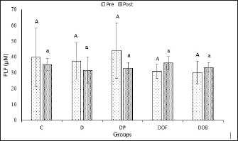 Fig. 3. Plasma PLP levels (µM) in rats with vitamin B6 deficiency who were substituted with black oncom for 7 weeks. Description: Data are presented as mean ± sd; C: control; D: vitamin B6 deficiency ≤0.6 mg/kg feed; DP: vitamin B6 deficiency + pyridoxine hydrochloride 7 mg/kg feed; DOF: vitamin B6 deficiency + black oncom flour (15.05 g/kg feed); DOB: vitamin B6 deficiency + black oncom biscuits (76.89 g/kg feed).; different capital superscripts indicate significant difference in pre-intervention condition, while different small superscripts indicate significant differences in post-intervention condition (p < 0.05). PLP level analysis in vitamin B6-deficient rats can be a reference for Hcy levels. Vitamin B6 deficiency can affect the increase of Hcy levels in the blood (hyperhomocysteinemia) before and after intervention, as shown in Figure 4. Before the intervention, Hcy levels were the same and were not significantly different (p > 0.05) in all groups. The D and DOF groups had high Hcy levels after 7 weeks of intervention, but the values were not significantly different from those of the other groups that had low Hcy levels (p > 0.05). There was a rise change in the Hcy levels of the D and DOF groups depending on the paired t-test results before and after the intervention (p > 0.05) and the reduction change of Hcy levels in the C, DP, and DOB groups (p > 0.05). However, the increase and decrease were not significantly different from those in the control group or the pyridoxine-substituted group because they were still within the normal range. Increased Hcy levels in the D groups were due to low vitamin B6 intake and low PLP concentration in the body. Substituting black oncom biscuits in a vitamin B6-deficient diet can reduce plasma Hcy levels, whereas black oncom flour increases plasma Hcy levels. The rising level of Hcy in the DOF groups might be due to the addition of methionine from the DOF, which was unbalanced with the vitamin B6 requirement.