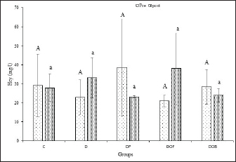 Fig. 4. Plasma Hcy levels (µg/ml) in rats with vitamin B6 deficiency who were substituted with black oncom for 7 weeks. Description: Data are presented as mean ± sd; C: control; D: vitamin B6 deficiency ≤0.6 mg/kg feed; DP: vitamin B6 deficiency + pyridoxine hydrochloride 7 mg/kg feed; DOF: vitamin B6 deficiency + black oncom flour (15.05 g/kg feed); DOB: vitamin B6 deficiency + black oncom biscuits (76.89 g/kg feed). Different capital superscripts indicate significant differences in pre-intervention conditions, whereas different small superscripts indicate significant differences in post-intervention condition (p < 0.05). DiscussionThis study examined black oncom-substitution in vitamin B6-deficient diet to determine vitamin B6 status. This study involved variables such as BW, feed intake, feed efficiency ratio, growth rate, PLP levels, and Hcy levels. This study was conducted for 7 weeks to prevent severe vitamin B6 deficiency. The study design is demonstrated in Figure 1 black oncom substitution was added in one dose depending on the vitamin B6 content of the ingredients (equal to 7 mg vitamin B6/kg feed), especially 15.05 g/kg feed of black oncom flour and 76.89 g/kg feed of black oncom biscuits.