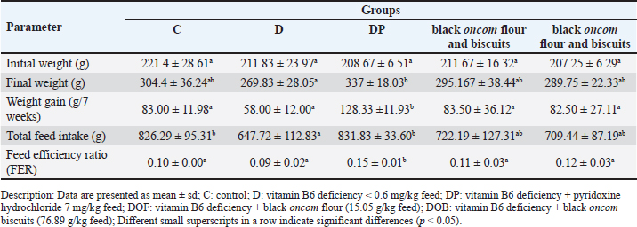 Analysis of vitamin B6 status (plasma PLP and Hcy levels)Sample preparationThe sample preparation procedure was based on a previously reported method (Al-Tannak et al., 2022). Briefly, 40 µl of plasma was placed into an Eppendorf tube. Next, 200 µl of acetonitrile was added to the deproteinization process. The mixture was vortexed for 10 seconds and centrifuged at 4,000 rpm for 15 minutes. Centrifuged samples were separated from the supernatant. A total of 100 µl of the eluate was added to 100 µl of the internal standard solution and diluted with 300 µl of HPLC-grade water. The sample was filtered using a 0.22 µm sterile nylon syringe filter (Membrane solution, Auburn, Alabama, USA), and a 10 µl sample was injected into the HPLC column. Solution and standard preparationStock solutions of PLP, Hcy, and the internal standard chlorogenic acid (IS) were prepared from 1 mg of PLP, Hcy, and IS standards respectively dissolved in 10 ml of HPLC grade water. The concentration of each standard (PLP, Hcy, and IS) was 100 ppm. The solutions were stored at 4°C in amber bottles covered with aluminum foil (Gandhi et al., 2024; Mateeva et al., 2023; Cabo et al., 2014). Stock solutions were used to prepare daily, freshly prepared standard series solutions. Instrumentation and chromatography conditions HPLC (Jasco LC-4000) was used. The analytes were eluted using two mobile phases. Mobile phase A contained 0.05 mM heptane 1-sulfonic acid sodium salt containing 0.05% TEA (pH 2.3, adjusted with orthophosphoric acid), whereas mobile phase B contained 100% methanol. The elution of the mobile phase was set at 67:33 (mobile phase A:B), with a flow rate of 0.5 ml/min. The composition of the mobile phase and the flow rate were as described previously (Gandhi et al., 2024). Analytes were separated using a C18 Inertsil ODS-3 column (particle size 5 µm, 4.6 × 150 mm) (C/N. 5050-01731, S/N. 1A5181171) from GL Science, Inc. (Tokyo, Japan), and the column temperature was maintained at 25°C. The injection volume of 10 µl was introduced into the sampler using a removable needle syringe (Hamilton Company, Nevada, USA), with a total running time of 11.5 minutes. All analysis processes were controlled using the Jasco software. Hcy and PLP levels were simultaneously determined and monitored using a Photodiode Array detector at a wavelength of 200–400 nm and a UV detector at a wavelength of 210 nm. The levels of Hcy and PLP were determined using a standard calibration curve. Validation of the vitamin B6 status analysisThe analysis of vitamin B6 status was validated using the standard addition method in three varied concentrations of Hcy, PLP, and chlorogenic acid internal standard (Shaik and Gan, 2013). The validation method included precision (% RSD), % recovery, and limit of detection (LOD) determined from intra-day analysis (n=2) according to the Guidelines for Standard Method Performance Requirements (AOAC International, 2016). Statistical analysisData are presented as the mean ± SD. Data on BW, feed intake, and feed efficiency ratio were analyzed using ANOVA with SPSS version 16.0. Plasma PLP and Hcy levels paired t-test results before and after the intervention. The test value was considered significant if the p-value was less than 0.05. If a significant difference was found, Duncan’s test was performed. Ethical approvalThe Animal Ethics Commission of the Faculty of Veterinary Medicine, IPB University, approved this study (number 040/KEH / SKE/XI / 2021). Each process complied with the Animal Care and Use Recommendations. ResultsBW, feed intake, feed efficiency, and growth rate of ratsBW characteristics were presented in the form of initial weight and final weight (Table 2). All groups had the same initial weight before the intervention, which was not significantly different (p > 0.05). At the end of the intervention (week 7), the weight of the DP group was not different from that of the C, black oncom flour and biscuitsgroups (p > 0.05). Group D had a lower weight gain than the other groups. However, the value was not significantly different (p > 0.05) between the C, black oncom flour and biscuits groups but was significantly different from the DP group (p < 0.05). The higher weight gain in the DP group might be due to the single pyridoxine supplementation. The characteristics of weight showed that a vitamin B6-deficient diet did not significantly affect weight in the 7-week intervention. Moreover, black oncom substitution in the form of flour and biscuits had no significant difference in weight gain, but it had a potential role in maintaining BW because the BW of the groups was not significantly different from the normal and pyridoxine-substituted groups. Table 2. BW, feed intake, and feed efficiency in vitamin B6 deficiency model rats were substituted with black oncom for 7 weeks.