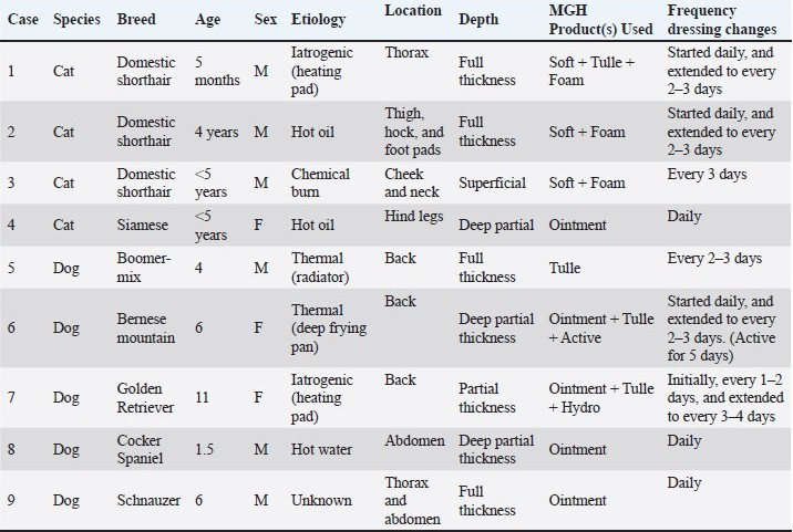 Data collectionPatient data were extracted from medical records and included species, breed, age, sex, cause, and classification of the burn, treatment protocol, healing time, complications, and outcome. Burn severity and depth were categorized according to veterinary burn classification systems (Vaughn and Beckel, 2012; Żwierełło et al., 2023), using visual cues such as color, moisture, and tissue texture to distinguish between partial- and full-thickness burns. Wound assessment data were derived from daily or periodic clinical notes and photographic evidence. Each photograph was dated and evaluated for the presence of key wound healing characteristics. When available, serial wound photographs were compared to track visual progression through inflammation, debridement, granulation, and epithelialization phases. Treatment approachAll animals were treated with MGH-based products (L-Mesitran Soft, Tulle, Ointment, Foam, or Hydro). Product selection was based on the wound’s anatomical location, exudate level, burn depth, and healing phase, as determined by the veterinarian. MGH was applied directly to the wound bed in a 2–3 mm thick layer and covered with an appropriate sterile secondary dressing. Wound cleansing prior to MGH application involved irrigation with saline or Ringer’s lactate solution to remove debris and exudate. In selected cases, mechanical or surgical debridement of necrotic tissue was performed before initiating MGH therapy. Dressing changes were initially performed daily to monitor early wound response closely and to prevent excessive exudate accumulation. Once infection and inflammation were controlled, the frequency of dressing changes was extended to every 2–3 days, depending on wound condition and exudate level. Systemic treatments (antibiotics, non-steroidal anti-inflammatory drugs, or corticosteroids) were administered when clinically indicated. Treatment duration and progression were individualized based on wound response. Assessment of wound healing parametersThe following five clinical parameters were systemically assessed for each case. 1). Reduction of inflammation: determined by a decrease in any sign of inflammation, such as erythema, edema, or exudate, or a decrease in superficial/deep infection signs as recognized by NERDS/STONEES (Woo and Sibbald, 2009). 2). Debridement: defined as the time to a clear decrease in necrotic or devitalized tissue, either spontaneously (autolytic) or assisted (mechanical/surgical). 3). Granulation tissue formation: identified by the appearance of bright red, moist, and finely granular tissue covering the wound bed. 4). Re-epithelialization: determined by the visible migration of epithelial cells from wound edges or islands, giving a glossy pink surface. 5). Complete wound healing: defined as full closure of the wound, with no open areas, infection, or necrotic tissue. The mean +/- standard deviation (SD) of the different outcome parameters was presented to provide indicative guidance regarding healing times. However, due to the relatively small sample size and the descriptive nature of the study, no statistical analyses were performed. Each parameter was recorded in days from the start of MGH treatment. However, some of the wounds were not treated directly with MGH and may have been there for a while; therefore, outcome parameters may be affected, explaining why only descriptive statistics were possible. Ethical approvalThis study did not require evaluation by an ethics committee, as the research was retrospective in nature and the subjects were not physically involved in the study. This work involved the use of non-experimental animals only, and the treatment was part of routine clinical care (non-interventional). Patients were treated according to local wound care protocols, and the MGH formulation used in this study is a registered (CE-certified and FDA-approved) wound care product intended for topical use in both humans and animals. Furthermore, owner consent was obtained for the use of images and data for publication. Patients are not recognizable from the images or associated data, and all efforts were madeto maintain the highest standards of scientific and ethical integrity. ResultsClinical cases showing the use of supplemented MGHIn the following section, we will present nine clinical cases demonstrating the application of supplemented MGH in veterinary patients. Case 1: Iatrogenic thermal burn injury in a catA 5-month-old male domestic shorthair cat was admitted to the hospital after being involved in a road traffic accident, which resulted in a diaphragmatic hernia and acetabular fracture. The patient underwent surgical intervention, including diaphragmatic hernia repair and femoral head and neck resection. Following surgery, systemic antibiotics (Amoxicillin and Clavulanic acid) were administered for 7 days. The patient had an adequate postoperative recovery, with stabilization achieved 3 days after the initial consultation. However, 3–4 days post-surgery, a non-delimited escharotic lesion was observed on the left thoracic wall. This indicated a moderate iatrogenic full-thickness thermal burn, most likely caused by a faulty heating pad used during surgery. Partial escharotomy was performed on day 12 post-surgery, marking the initiation of wound care. Blood analysis showed minor changes, including neutrophilia, monocytosis, and hematocrit values at the lower end of the reference range. The wound showed a high level of exudate and slough (Fig. 1A), and a wound swab confirmed infection with beta-hemolytic Streptococcus spp and Escherichia coli, both sensitive to doxycycline. Wound care products based on MGH supplemented with vitamins were used for wound management. For initial exudate control, an MGH-based foam dressing (L-Mesitran Foam) was applied, with dressings changed daily. Analgesia (Buprenorphine) was administered every 12 hours for the first 10 days.
