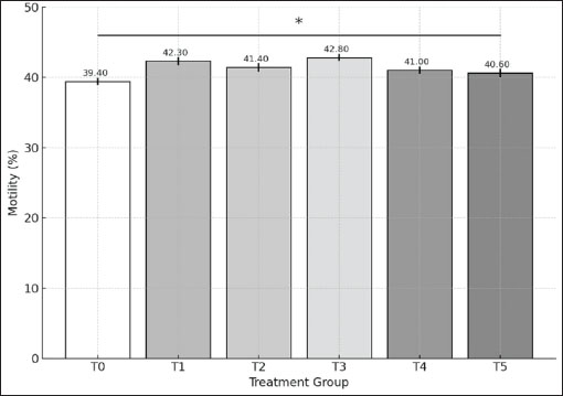 Fig. 1. The average of post-thawing spermatozoa motility in each of treatment group as determined using the ANOVA test which shows *p < 0.05 among T1, T2, T3, T4, and T5 to T0. Notes: Treatment groups: T0=0 mg/dL EGCG (control), T1=50 mg/dL, T2=100 mg/dL, T3=200 mg/dL, T4=400 mg/dL, and T5=800 mg/dL. Data are presented as mean values with significance indicated ***p < 0.001. Sperm’s viabilitySpermatozoa staining is done to help with morphological and morphometric observations of spermatozoa, as shown in Figure 2.