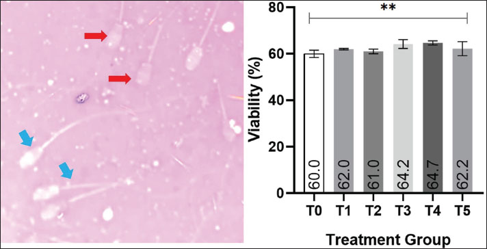 Fig. 2. Effect of EGCG supplementation on post-thaw sperm viability in goats. (A) Image of (blue arrow) live and (red arrow) dead sperm on eosin-nigrosine staining (Merck, Germany) with 400× magnification, Olympus CX-21®, Tokyo, Japan. (B) The average of post-thawing spermatozoa viability in each of treatment group as determined using the ANOVA test which shows *p < 0.05 between T3 and T4 to T0, T1, T2, and T5. Notes: Treatment groups: T0=0 mg/dL EGCG (control), T1=50 mg/dL, T2=100 mg/dL, T3=200 mg/dL, T4=400 mg/dL, and T5=800 mg/dL. Data are presented as mean values with significance indicated ***p < 0.001. The Shapiro–Wilk test for normality and Levene’s test for homogeneity indicated that the data were normally distributed and homogeneous (p > 0.05). Therefore, the analysis was continued with a one-way analysis of variance (ANOVA). The results showed that EGCG supplementation had a significant effect on post-thaw sperm viability (p < 0.05). The mean viability values for T0, T1, T2, T3, T4, and T5 were 60.0%, 62.0%, 61.0%, 64.2%, 64.7%, and 62.2%, respectively. Statistical comparison revealed that T4 exhibited the highest viability, which was significantly different from T0, T1, T2, and T5 (p < 0.05), but not significantly different from T3 (p > 0.05). BCL-2 expressionThe post-thaw expression of BCL-2 in Kacang goat spermatozoa is shown in Fig. 3. Positive BCL-2 expression was identified by brownish staining localized in the head and midpiece regions of the spermatozoa, reflecting its anti-apoptotic role in enhancing sperm survival after cryopreservation. Representative microscopic images (Fig. 3B) further confirm these findings, showing more intense brown staining in the head and midpiece of spermatozoa in treatment groups compared with the control.