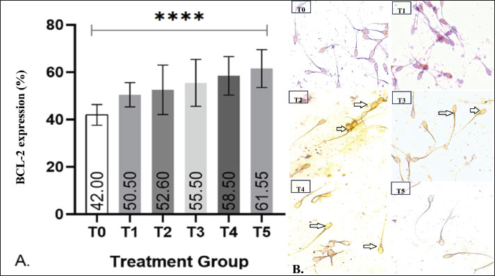Fig. 3. Effect of EGCG supplementation on BCL-2 protein expression in post-thawed goat sperm. (A) The graph presents the mean percentage of BCL-2 expression in post-thaw Kacang goat spermatozoa across EGCG treatment groups. One-way ANOVA analysis revealed a highly significant difference (****p < 0.0001) between the control (T0) and treatment groups (T1–T5). (B) Representative microscopic images of BCL-2 expression detected in post-thaw spermatozoa, visualized using the Avidin–Biotin Complex staining technique at 400× magnification. Positive BCL-2 expression is indicated by black arrows. Notes: Treatment groups: T0=0 mg/dL EGCG (control), T1=50 mg/dL, T2=100 mg/dL, T3=200 mg/dL, T4=400 mg/dL, and T5=800 mg/dL. Data are presented as mean values with significance indicated ***p < 0.001. Quantitative analysis revealed that the control group (T0) exhibited the lowest BCL-2 expression, with a mean value of 42%. In contrast, all EGCG-supplemented groups (T1–T5) demonstrated higher BCL-2 expression, with mean values of 50.5%, 52.6%, 55.5%, 58.5%, and 61.55%, respectively. Statistical analysis using ANOVA indicated a highly significant difference among groups (p < 0.0001). The highest expression was observed in T5, suggesting that EGCG supplementation effectively upregulated BCL-2 in a dose-dependent manner. CPT2 gene expressionThe nonparametric Kruskal–Wallis test revealed a significant difference in CPT2 expression among the six treatment groups (p < 0.05). As shown in Figure 4, the control group (T0) exhibited the highest mean expression (43.39%), whereas all EGCG-supplemented groups (T1–T5) showed lower values, ranging from 34.50% (T1) to 40.03% (T4). Post hoc comparisons indicated that CPT2 expression was significantly reduced in the treatment groups relative to T0 (p < 0.0005). This downregulation of CPT2 suggests that EGCG supplementation effectively attenuates oxidative stress during cryopreservation.
