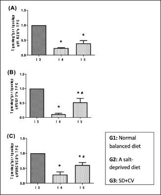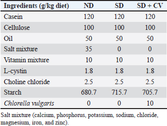 AbstractBackground: Malnutrition is one of the predisposing factors of disturbance in some physiological functions, including reproductive health. Currently, many people and animals are globally facing micronutrient deficiency, especially in lands with poor soils in organic matter and nutrients. Egyptian soil and, consequently, crops were found to be deficient in micronutrients to varying degrees. Aim: This study aimed to investigate the potential fertility-enhancing effects of the microalgae Chlorella vulgaris (CV) on male rats fed a salt-deficient diet. Methods: Forty-five adult rats (15 rats each) were divided into three groups (G1, G2, and G3). G1 received a normal balanced diet, G2 received a salt-deprived diet (SD), and G3 was supplemented with SD plus Chlorella 1% of the diet (SD + CV). After eight successive weeks of treatment, the animals were fasted overnight, anesthetized, and sacrificed. The collected plasma was analyzed for organ function-related constituents, oxidative biomarkers, and testosterone levels. Epididymal sperms were also examined. Samples of testis were analyzed for quantitative gene expression of GPX4, SOD1, and SPATA6 genes. Additionally, histopathological examination was performed for testis, liver, and kidney samples. Results: The results obtained from the current study revealed that the plasma of the SD group had higher levels of oxidative biomarkers and inflammatory cytokines, elevated urea, creatinine, and uric acid levels, and liver enzymes, and lower testosterone levels than the normal control group. In addition, lower sperm motility and higher abnormality and downregulation of SPATA6 genes and degenerative changes were found in the testes, liver, and kidneys. The administration of (SD + CV) restored these alterations. Conclusion: CV could be used as a supplement to compensate for nutrient or salt deficiency and correct the resultant disorders, especially reproductive affections, in males. Keywords: Male fertility, Zinc and copper deficiency, Chlorella vulgaris, SPATA6, Oxidative stress. IntroductionEssential metals, particularly zinc (Zn), selenium (Se), manganese (Mn), iron (Fe), copper (Cu), molybdenum (Mo), and cobalt (Co), are generally thought to be advantageous or even protective for male reproductive activities, although excess of these elements can have negative consequences as well (Ribeiro et al., 2021). Fe, Zn, and Se are examples of trace metals that are classified as components with antioxidant action (Nenkova et al., 2007). The soil in the Middle East region has low organic matter and is deficient in micronutrients. Egyptian soil and cultivated crops are deficient in Zn, Cu, Fe, and Mn to varying degrees (El-Fouly et al., 2010). This results in health problems in humans and animals fed on such crops. Currently, two billion people globally are facing micronutrient deficiency (Velu et al., 2014). Male reproduction depends on trace elements, and their lack may result in poor spermatogenesis, decreased libido, and decreased male fertility (Tvrdá et al., 2013). According to Zaman et al. (2017), maize is the most prone crop to zinc deficiencies; rice and wheat are also very sensitive. Zinc and copper must be included in the diet because they are required for many different biochemical processes in the body (El-Said et al., 2019). Chlorella vulgaris (CV) is a highly nutritious unicellular freshwater microalgae that is rich in many important components, including proteins, carbohydrates, vitamins, fatty acids, and trace elements such as zinc, copper, and magnesium. These components are essential for the activity of antioxidant metalloenzymes and male reproduction (Osama et al., 2019; Hanafi et al., 2022). Moreover, CV is rich in polyunsaturated fatty acids (PUFAs), which have been found to improve male fertility as they could increase ejaculate volume, sperm cell concentration, viability, and motility of fresh and post-thawed sperm cells (Khoshvaght et al., 2016; Hanafi et al., 2022). Furthermore, CV has strong antioxidant characteristics that are attributed to bioactive substances such as saponins, alkaloids, flavonoids, and phenols. These substances act as peroxyl radical scavengers, successfully preventing free radical production within living cells. Additionally, CV prevents lipid peroxidation and inhibits PUFA oxidation (Alshafei et al., 2022; Makipour et al., 2024). In this instance, CV, which is frequently used as a dietary supplement, might be a good option to improve the function of the male genital system under normal or oxidative stress conditions. The current study aimed to clarify the efficiency of CV in compensating for the negative effect of mineral deficiency on male fertility. Gene expression analysis and biological and histopathological changes were studied. Materials and MethodsThe microalga and CV were provided by the Food Industry and Nutrition Research Institute, National Research Center, Cairo, Egypt. Nutrient analysis of CV(100 gm powder)The CV powder was analyzed (Table 1) for minerals, carbohydrates, proteins, fats, and ash according to the method of Canelli et al. (2020). Minerals and trace elements were estimated by atomic absorption. Table 1. Types of diets prepared for animal feeding: ND, normal balanced diet, SD: Salt deprived diet; SD + CV: SD enriched with CV at a concentration of 1%.