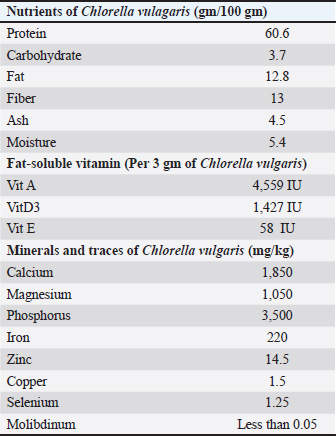 Histopathological examinationFor the light microscopic examination, tissue specimens (testis, livers, and kidneys) were fixed in 10% buffered formalin using tissue cassettes. Tissue sections were cut into 4–5 μm, and stained with Hematoxylin and Eosin (Suvarna et al., 2018), and subjected to microscopic examination by a pathologist. Tissue samples were examined using a Leica UA510CA light microscope and a Leica Q-Win Image Analysis system (Leica Micros Imaging Solutions Ltd., Cambridge, UK). Statistical analysisResults are presented as mean ± SEM. Statistically significant differences between groups were determined using one-way analysis of variance (one-way ANOVA), followed by Tukey–Kramer multiple comparison test. GraphPad Prism version 8 was used for data analysis. The significance level was set at p < 0.05 for all tests. Ethical approvalAnimal caring and treatments throughout the experiment were carried out according to the approval and guidelines given by the Institutional Ethical Committee for Medical Research of the National Research Centre, Egypt (Code No: 12-115). This study was approved by the Institutional Ethical Committee for Medical Research of the National Research Centre, Egypt. The study was reported in accordance with the Animal Research: Reporting of In Vivo Experiments (ARRIVE) guidelines (ethical approval no. 20170). ResultsAnalysis of CVnutrientsThe results of the current study (Table 3) revealed that CV was a rich source of protein and vitamins A and D. It was also rich in minerals and traces of essential minerals for different biological processes, such as calcium, magnesium, phosphorus, iron, zinc, copper, and selenium. Simultaneously, the hazardous molybdenum was found nil. Table 3. Analysis of nutrients antioxidant activity of Chlorella vulgaris.