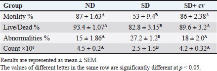 Fig. 3. (A–D): Photomicrograph of testicular tissue sections stained with H&E (×100) showing normal seminiferous tubules of regular contour, spermatogenesis, and narrow intertubular spaces with Leydig cells (A) in rats of the ND group. Rats that received a SD showed severe vacuolar degeneration and necrosis of spermatogonial cells as well as desquamation of spermatogonial cells lining seminiferous tubules (black arrows) with subcapsular congestion (red arrows) (C). Testis of (SD + CV) treated rats showing mild testicular degeneration associated with marked restoration of normal histologic architecture (D). Table 4. Semen picture of rats given Chlorella vulgaris.