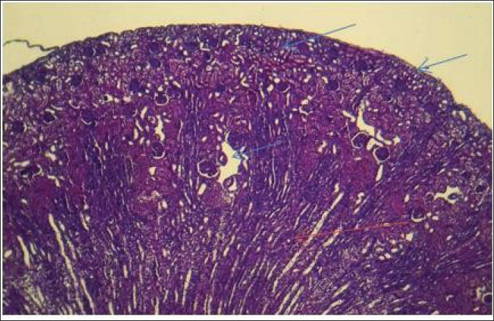 Fig. 3. Cross-histological section of cortex of 1-week-old hamsters showing the proximal and distal tubules with simple cuboidal epithelium (red arrow) and glomerulus arterioles (blue arrow). 40x. Alcian blue staining.