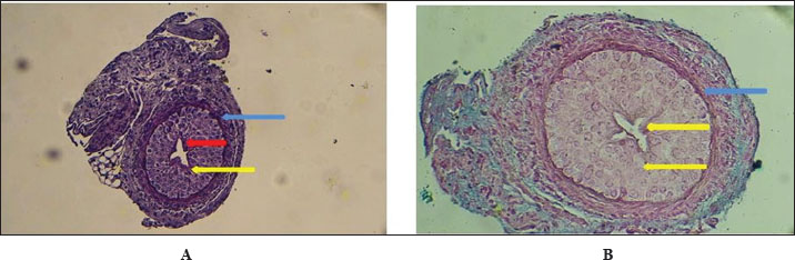 Fig. 13. Cross-histological section of the ureter in hamsters aged 2 months showing a deep lumen (red arrow) in the middle, a simple squamous epithelial layer (yellow arrow), and smooth muscle (blue arrow), A- 10x. Masson’s trichrome stain, B- 40x. Van Gieson staining. DiscussionAt 1 week of age, the kidney of the hamster showed typical signs of early postnatal development, such as a defined renal capsule, not so mature renal corpuscles with narrow spaces where blood fluid was processed, and the inner tubule walls were mainly made up of simple cuboidal cells. These results showed that in rodents, development of the kidney glomerular and tubular structure continues shortly after birth, serving the kidney’s maturation (Kose et al., 2020). Indeed, the thin connective capsule seen on both H&E and Masson’s Trichrome stain indicates that mesenchymal cells are already dense, and this observation fits with what has been found in developing rodent species, where the renal capsule becomes thicker and starts changing by the second week after birth (Singh et al., 2022). A hamster kidney has renal corpuscles with a narrow space for forming urine, and the Bowman’s capsule is less developed, indicating that glomerular growth in the hamster has just begun. These observations are consistent with previous findings on neonatal rats and mice that the kidneys’ filtration ability was limited during the first week of life (Lee et al., 2019). Observing articular arteries near the glomeruli is essential because it represents vascular recruitment that supports the continuous creation of blood vessels in the developing kidney tissue (Chou et al., 2021). In addition, Alcian blue staining confirmed the presence of acidic glycosaminoglycans in the basement membranes, which is an important early indicator of nephron development and the formation of tubule centers in epithelial cells (Sajjad et al., 2020). The appearance of Henle’s loops and collecting ducts on slides with PAS and Van Gieson stains shows that urine was being concentrated at this point, albeit only to a small extent in the renal medulla. As Zhang et al. (2023) described in their study, the simple squamous epithelium found in the thin limbs of Henle’s loop in neonatal rodents was a sign that the structure was immature and unsuitable for effective countercurrent exchange until the third postnatal week. In addition, the PAS stain revealed cells that looked like zymogens, which might match immature tubular epithelial cells that were not yet fully differentiated (El-Mahdy et al., 2019). Postnatal growth and development in the ureter were observed after H&E, Alcian blue, PAS, and Masson’s trichrome staining. The fact that the lumen was narrow and surrounded by a simple squamous epithelium, along with the emergence of a double layer of smooth muscle tissue, suggests the initiation of peristalsis. In newborn rats, smooth muscle development occurs in the late fetal stage and continues after birth to form the two muscle layers (Matsumoto et al., 2020). At this point, Alcian blue detected in the ureter confirms the presence of mucopolysaccharides that could help protect the lumen and make the tract more flexible (Ishak et al., 2022). It could also show early formation of the stromal matrix in the capsule and interstitium by finding collagen fibers during Masson’s trichrome staining. It is essential to keep the structure of the kidneys intact and to attach the nephrons. Wu et al. (2021) revealed a similar behavior in the kidneys of newborns, as increased collagen types I and III are seen during the first postnatal week, and these help form tubules and stabilize blood vessels. At 1 week of age, the hamster kidney and ureter are changing from a prenatal structure to a fully functioning one. They confirm what has been found in mice and improve the development of the kidneys and ureters in hamsters, a major animal used in renal medical studies (Al-Rubaye et al., 2018; Kim et al., 2024). The 2-week observations revealed that both glomeruli and tubules were maturing and specializing in the kidney. The cortex appears thicker, has more cells, and the parenchyma is organized more clearly in these structures. Bowman’s capsules were thicker, and the renal corpuscles were also more formed. Important changes in the kidney, including elongation of podocyte foot processes and growth of glomerular capillaries, occur between days 10 and 15 after birth (Abdel-Rahman et al., 2020). The presence of PAS-positive material in the capsule and basement membranes of Bowman’s capsule is another indication of glycoprotein accumulation during postnatal kidney development. The renal corpuscles stand out with their unique build and know-how of filtering blood. A further examination in neonatal Wistar rats indicated that the parietal epithelial cells depositing more extracellular matrix material caused the thickening of the Bowman’s capsule during the second week postbirth (Salem et al., 2021). Zymogen-like cells in the proximal tubular epithelium might start the development of enzyme creation, as it was shown in rabbit and guinea pig kidneys when renal tubules are starting to differentiate (Zahra et al., 2019). The medullary region contains vertically arranged, straight tubules that are covered by simple columnar epithelium. They probably represent the early part of the collecting ducts and the thick parts of the ascending limbs. Setting up the renal structure in this manner was necessary to develop the main renal countercurrent system. These developments in medullary extensions and epithelium were in line with the explanations provided by Balasubramanian et al. (2018), who said that they boost both sodium reabsorption and urine concentration in rats beginning on day 14 after birth. In this process, the Van Gieson stain enables the maturation of the renal tissue and supports the correct placement and stability of nephrons. There were more layers in the renal capsule, indi
