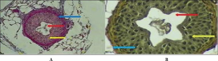 Fig. 8. Cross-histological section of the ureter in hamsters aged 2 weeks showing a mild lumen (red arrow) in the middle, simple squamous epithelial (yellow arrow), smooth muscle A-10x H&E stain B- 20x. alcian blue.