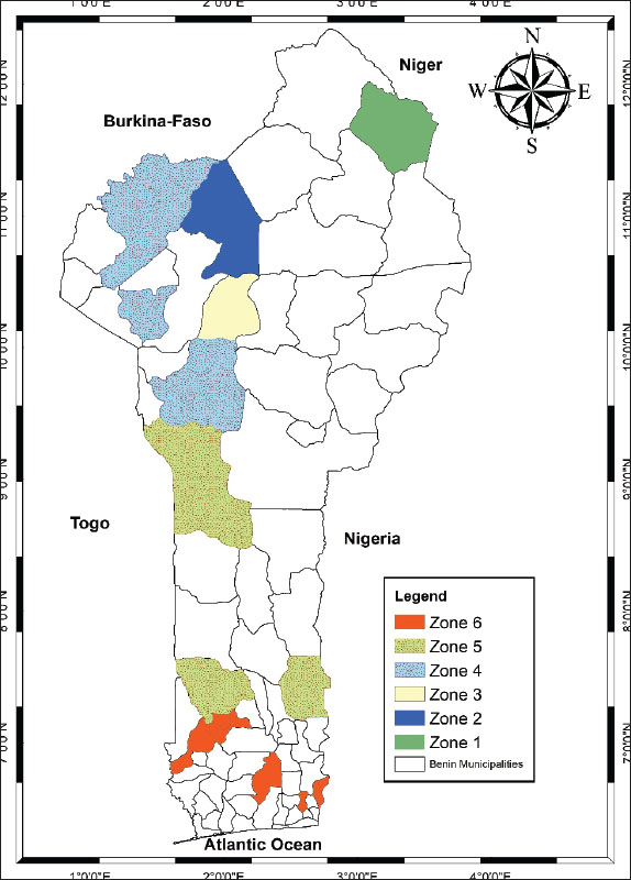 AbstractBackground: Livestock farming constitutes a principal component of the economic sector in West Africa, particularly within rural communities. Aim: A cross-sectional survey was performed in six agroecological zones to advance the development of small ruminant farming in Benin and elevate producers’ incomes, aiming at categorizing the diverse forms of small ruminant farming and uncovering the essential factors that differentiate them. Methods: A total of 288 farmers from various regions were surveyed using a semistructured questionnaire implemented on KoboCollect. Data were then analyzed using multiple correspondence analysis (MCA) and ascending hierarchical classification (AHC). Results: Approximately 70% of the farmers interviewed were men, compared with 30% of the women. More than half (55%) had received no formal education, whereas the majority (91%) were fairly experienced and had been raising small ruminants for at least 5 years. Three farming systems were adopted for sheep and goat rearing: extensive, semi-intensive, and intensive, practiced by 78%, 18%, and 2.8% of farmers, respectively. A number of diseases were frequently noted, primarily respiratory illnesses such as pneumonia (67%), abscesses (48%), and dermatitis (33%). The MCA identified three clusters: type 1, which is composed of dairy farms and accounts for 14.5% of the total number of farmers; type 2, which accounts for 50% of the total number of farmers and is composed of meat producers with good husbandry practices and management of health constraints; and type 3, which accounts for 37.7% of the total number of farmers and is composed of meat producers with acceptable husbandry practices but poor management of health constraints. Conclusion: The milk-producing farms adopted good feeding practices and regularly vaccinated and dewormed their livestock. In addition to meat production, sheep and goats can be used for milk production in Benin if good husbandry practices are promoted and adopted in flock management. Keywords: Typology, Sheep, Goats, Milk, Benin. IntroductionLivestock farming constitutes a principal component of the economic sector in West Africa, particularly within rural communities. It is a vital agricultural element, contributing approximately 44% to the sub-region’s agricultural GDP (Valerio et al., 2020; Eeswaran et al., 2022). In 2022, the population of small ruminants in the 16 countries of West Africa was estimated to be 169.81 million sheep and 224.27 million goats. These figures underscore the benefits of producing these animal species, particularly regarding their contribution to food security and poverty alleviation. In Benin, small ruminants are mainly reared within various farming systems across the country’s eight agroecological zones. These animals constitute a significant source of supplementary income and are the second most important animal species, with an estimated population of approximately 2,295,522 sheep and 2,362,001 goats (Dossa et al., 2008; RNA, 2021). These animals are appropriately adapted to various agroecological settings and represent an important source of income, animal protein, and capital for households (Dossa et al., 2008; Zanou et al., 2023). To improve farmers’ incomes and the country’s food security, the Benin government has implemented since 2016 several projects to promote ruminant farming, including sheep and goat farming. For the optimal impact of the various interventions, a thorough understanding of the different farming systems and their determinants is required. Even with their evident importance, the small ruminant production systems in Benin display significant heterogeneity, indicative of the diverse socio-economic, environmental, and cultural settings found throughout the country (Adamou et al., 2024). Variability can be observed in herd management practices, feeding approaches, production targets, and intensification levels (Azando et al., 2022; Dimon et al., 2022; Edoh et al., 2023) . Livestock typology is a classification approach that categorizes farms or livestock production systems based on specific criteria. These criteria are diverse and may involve the mode of production, animal breeds, production goals, husbandry practices, and farmers’ socio-economic characteristics. Its primary goal is to break down the complexities of reality to improve the comprehension of the different livestock farming methods employed in a particular area (Walder et al., 2012; Huber et al., 2024). This classification method has been used in various contexts to explore and describe the diversity of farming systems and their structural and socio-economic characteristics to develop evidence-based recommendations for their improvement (Soini et al., 2012; Seidou et al., 2016; Zoma-Traoré et al., 2020; Valverde Lucio et al., 2021; Zinsou et al., 2024). An in-depth understanding of livestock typology is crucial for the design and implementation of relevant and effective livestock development policies that respond to each system’s specific challenges and promote sustainable production. Within this framework, this article proposes a characterization of the different types of small ruminant livestock farming in Benin, identifying the key factors that distinguish them and discussing the implications of this typology for improving the sector’s productivity and resilience. Materials and MethodsStudy areaThis study was conducted in Benin, a West African country characterized by great climatic, soil, and plant diversity. It is in the Gulf of Guinea between Togo and Nigeria. This study covered 17 municipalities in six of the country’s eight agroecological zones. The municipality of Malanville is located in the extreme north zone (Zone 1), which is characterized by the northern boundary of the country, and the presence of the Niger River and its tributaries. The climate is Sudano-Sahelian, with a long dry and rainy season. Temperatures are often excessive, reach