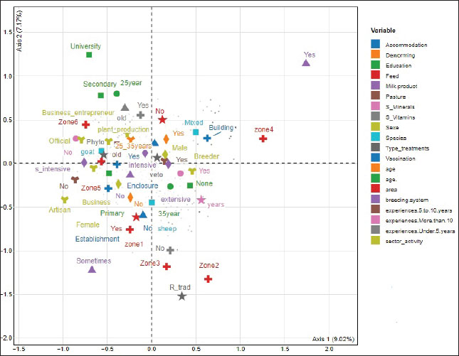 Health constraints and management methodsSeveral diseases and clinical signs were commonly observed on the visited farms (Table 3). These were mainly respiratory diseases, such as pneumonia (67%), abscesses (48%), dermatitis (33%), coryza (33%), mastitis (12%), peste des petits ruminants (11%), and diarrhea (7.3%). A large proportion of respondents practiced vaccination (73%), regular deworming (59%), and ectoparasite control (34%) to prevent these diseases. Furthermore, 86% of the respondents isolate the herd from sick animals when an epidemic occurs in the herd, while 53% remove sick animals from the herd either by slaughter for consumption or sale at the livestock market. Only a minority (5.9%) used alternative methods, such as phytotherapy, to treat diseases, while 66% went to the veterinarian and used medicines available in veterinary clinics. Oxytetracycline is the best-known antibiotic, which is used in 90% of farms. Farm typologyMCA was applied to 17 variables, yielding 39 dimensions explaining 100% of the total variability observed, while the first 10 explained 56.7% of this variability according to Ward’s criteria (Fig. 2). However, the remainder of this study focuses on the first two dimensions. The results of the MCA are shown in Figure 3. The first axis (dimension 1) retained 18% of the total inertia and showed a strong positive correlation with milking variables, followed by agroecological Zone 4 and small ruminant housing in buildings. Therefore, farmers who milk small ruminants are much more concentrated in the West-Atakora agroecological zone (Zone 4) and prefer to keep their animals in buildings. Dimension 2 retained 14.37% of the total inertia and showed a strong correlation with feed vitamin supplementation, feed mineral supplementation, and milking. Milking is correlated with vitamin and mineral supplementation in the diet of small ruminants. The AHC identified three clusters of farmers, as represented by the dendrogram in Figure 4. Cluster 1 comprises dairy farmers, cluster 2 comprises meat farmers with good husbandry practices and management of health constraints, and cluster 3 comprises meat farmers with acceptable husbandry practices but poor management of health constraints. Comparison tests at the 1% threshold showed no significant differences between the clusters identified according to age, sex, education level, and activity sector. The three groups (Fig. 5) differed in terms of professional experience, whether or not small ruminants were farmed, the ecological zone to which they belonged, the farming system, the type of small ruminant reared, the type of housing, fodder intake, vitamin supplementation, mineral supplementation, vaccination practice, deworming practice, and the type of care adopted for disease control. The characteristics of these groups are shown in Table 4. In Group 1 (n=42), 74% of farmers milk their animals and are located exclusively in the West Atakora zone (100%), where they practice mixed sheep/goat rearing (82%) in the extensive rearing system (100%). Animals were housed in fixed buildings (100%) with controlled access to the outdoors. Animals were fed pasture (98%) with mineral (100%) and vitamin (95%) supplements. These farmers also adopted exceptional care practices, including vaccination (100%) and regular deworming (93%) of the animals, with recourse to veterinary medicines for care (93%). Farmers in Group 2 (n=146) are located in several agroecological zones, and the majority (77%) farm a single goat or sheep species. Farmers in this group also practice extensive farming (75%), but a proportion also practice intensive (6%) or semi-intensive (20%) farming. Furthermore, the animals are housed in precarious conditions, either in unsecured open barns (38%) or roofless pens (33%), which do not protect the animals from rain and sun. Furthermore, the animals in this group were also fed pasture (75%) or fodder (37%), but only half (50%) of the farmers in this group added minerals. A significant proportion of farmers in this group did not practice deworming (44%) or vaccination (27%). Farmers in Group 3 (n=100) were evenly distributed among the different agroecological zones of the country and were dominated by meat-producing farmers. The animals in this group were mainly housed in secure buildings (38%) or open barns with roofs and were fed on pasture (93%) with fodder (75%) and mineral supplements (93%). Unfortunately, a large proportion of farmers in this group do not vaccinate (42%) or deworm (54%) their animals, while 20% use medicinal plants or traditional recipes to treat their animals. Characteristics of the dairy farmsThe results showed that a significant proportion (14.5%) of the small ruminant farmers surveyed milked sheep and goats either regularly (74%) or occasionally (14%). The latter mainly belong to typological Group 1 (74%) and are distributed mainly in the northeast of the country in the departments of Atacora and Donga, and milk both species. In general, the majority of these farmers (80%) have not received any formal education, and 88% have been farming for more than 5 years. Although they practice family farming (82%) where the animals are fed on pasture (92.5%), they adopt very good farming practices characterized by housing the animals in modern buildings (74%) and supplementing the feed with minerals (92.8%) and vitamins (89%). In addition, they were vaccinated (92.9%), dewormed (83.3%), and made greater use of veterinarians to monitor their animals’ health. Therefore, these practices had an impact on the better milk performance observed on these farms, compared with farmers in typological Groups 2 and 3, who adopted far more poor practices in terms of housing, feeding, and animal disease management.