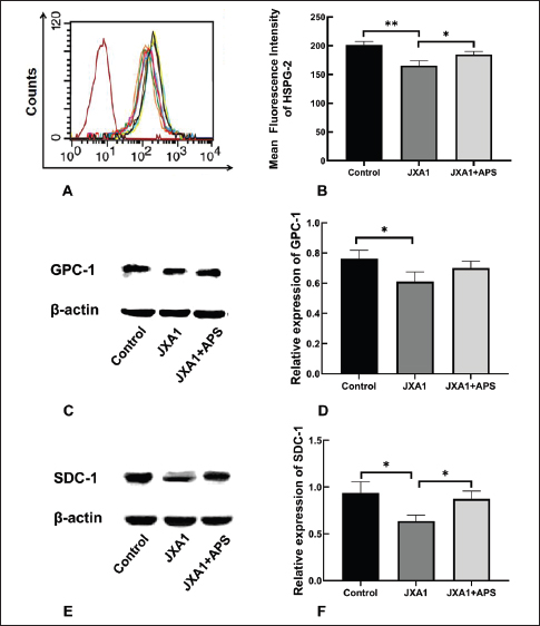 Fig. 1. Effects of astragalus polysaccharide on glycocalyx proteoglycan components in HP-PRRSV-infected porcine pulmonary microvascular endothelial cells. (A) HSPG-2 levels were quantified by flow cytometry. (B) Statistical analysis of HSPG-2 levels. (C) GPC-1 levels were quantified by Western blot. (D) Statistical analysis of GPC-1 levels. (E) SDC-1 levels were quantified by Western blot. (F) Statistical analysis of the levels of SDC-1. “*” indicates P < 0.05, “**” indicates P < 0.01.
