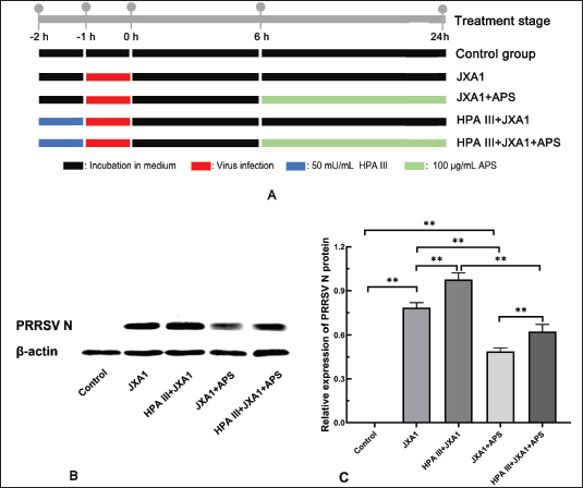 Fig. 3. Inhibition of astragalus polysaccharide on HP-PRRSV JXA1 strain replication in porcine pulmonary microvascular endothelial cells. (A) Schematic illustration of experimental groups and treatment procedures. (B) Western blot quantification of PRRSV N protein levels. (C) Statistical analysis of PRRSV N protein levels. “*” indicates P < 0.05, “**” indicates P < 0.01. MVECs were lysed using RIPA buffer (Beyotime, #P0013B) and centrifuged at 14,000 g for 10 minutes to collect supernatants. Protein concentrations were measured using the BCA assay kit (Beyotime, #P0011) and adjusted to the same level for each group using sample loading buffer, followed by boiling to denature the proteins. Electrophoresis was performed for approximately 2 hours at a constant voltage of 75 V, followed by wet transfer at a constant current of 400 mA for 25 minutes. After blocking with a skim milk solution and washing with Tris-buffered saline and Tween-20 buffer (Solarbio, #T1081), the PVDF membranes (Solarbio, #YA1691) were incubated in antibodies against β-actin (1:20,000), SDC-1 (1:3,000), GPC-1 (1:1,000), VCAM-1 (1:500, Santa Cruz, #sc-18864), ICAM-1 (1:10000, Proteintech, #10831-AP), and PRRSV N protein (1:1,000, Bioss, #bs23941R) overnight at 4°C. After washing, the PVDF membranes were incubated in HRP-conjugated IgG (1:1000, Beyotime, #A0208) at room temperature with shaking for 1 hour. The PVDF membranes were developed using an ECL chemiluminescence kit (Beyotime, #P0018S) and imaged using a gel imaging system. Measurement of trans-endothelial electric resistance (TEER)MVECs were passaged into Transwell culture inserts (Corning, #3421), and cell monolayers were considered to have formed when the TEER no longer increased within 12 hours. Cells were divided into five groups according to treatment strategy (Fig. 3A), each with three replicates. TEER was measured at 0, 12, 24, 36, 48, 60, and 72 hours using an epithelial cell resistance meter (Millipore, Millicell® ERS-2). Each well was measured thrice at different points, and the average value was calculated. The TEER value of each well was calculated using the formula below, where the blank resistance value was the resistance measured in wells without cells, and the area of the Transwell insert membrane used was 0.33 cm². The TEER values of each group were expressed as “mean ± SD” and analyzed using GraphPad Prism 8 software, with p < 0.05 considered statistically significant. TEER=(measured resistance value of each well - blank resistance value) × 0.33 Evaluation of the permeability of horseradish peroxidase-streptavidin (HRP-SA)The material permeability of the cell monolayer was determined using the leakage ratio of HRP-SA, as previously described (Chen and Yeh, 2017). Cells were subcultured and grouped as described in Section “2.7. Measurement of the TEER.” At 12, 24, 36, 48, 60, and 72 hours, 0.1 ml of 1 mg/ml HRP-SA solution (Merck, #06102022) was added to each insert well. After a 30-min incubation, the media in the lower chamber were sampled and replaced with new media. The OD values were measured at 492 nm using the TMB color development kit (Bioss, #C04-03001) according to the manufacturer’s instructions. Neutrophil migration assayMVECs were seeded in Transwell inserts (Corning, #3421) and grouped according to Fig. 3A. Twenty-four hours after APS treatment, 0.1 ml of 1 × 106 cells/ml neutrophils was added to the Transwell inserts. After a 4-hour incubation, neutrophils were collected from the lower chambers and counted using a counting chamber. The neutrophil migration rates for each group were calculated using the following formula: Neutrophil migration ratio (100%)=number of neutrophils in the lower chamber/number of neutrophils added in the upper chamber × 100%. Neutrophil bactericidal assayNeutrophils were collected from the lower chambers of each group according to Section “2.9. Neutrophil migration assay” and were centrifuged and resuspended in a maintenance medium without antibiotics. Their densities were adjusted to be the same. Dilute the logarithmic phase bacteria 105 folds and added to the neutrophil suspension at a 1:10 volume ratio. After incubation for 3 hours, 0.1 ml of the medium was sampled and plated in triplicate onto bacterial culture plates. The plates were cultured for approximately 16 hours, and the bacterial colonies were counted in each group. Data analysisWestern blot results were analyzed using ImageJ software to calculate the grayscale values of the protein bands, with the relative protein expression defined as the ratio of the β-actin band. Flow cytometry was used to assess the relative fluorescence intensity compared to the control. All experiments were performed using three independent replicates (n=3), and each replicate was derived from a distinct cell culture preparation. Data were presented as mean ± SD and analyzed using GraphPad Prism 8.0 software. Specifically, two-way ANOVA (factors: treatment and time) followed by Tukey’s post hoc test was applied to the TEER and HRP-SA leakage data, whereas one-way ANOVA with Tukey’s test was used for all other datasets. Statistical analysis used one-way or two-way ANOVA with Tukey’s post hoc test in GraphPad Prism 8.0 software, with Statistical significance set at P < 0.05 or P < 0.01. Ethical approvalNot needed for this study. ResultsGlycocalyx component expression in HP-PRRSV-infected MVECsFlow cytometry and Western blot results indicated that HP-PRRSV infection led to a decrease in the expression of proteoglycans HSPG-2, GPC-1, and SDC-1 (Fig. 1) and reduced the LCA, DSA, and PHA-E-reactive glycan ligands (Fig. 2) in porcine lung MVECs, whereas APS treatment significantly alleviated this damage. These data indicate that APS significantly repaired the damage to glycocalyx components caused by HP-PRRSV.