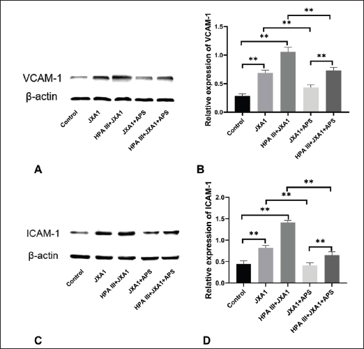 Fig. 5. Effects of astragalus polysaccharide on the permeability of horseradish peroxidase-labeled streptavidin across the monolayer of porcine pulmonary microvascular endothelial cells infected with HP-PRRSV JXA1. “*” indicates P < 0.05, “**” indicates P < 0.01. VCAM-1 and ICAM-1 expression in HP-PRRSV-infected MVECsThe shedding of glycocalyx would bring out adhesion molecules on cell surfaces and affect their expression, recruiting and activating inflammatory cells. Based on previous transcriptome sequencing results (Wu et al., 2023), the expression of two adhesion molecules was investigated in this experiment. The results showed that normal porcine lung MVECs had low VCAM-1 and ICAM-1 expression, and HP-PRRSV infection significantly increased the expression of both adhesion molecules (P < 0.01), and HPA III treatment further promoted their expression (Fig. 6). Moreover, APS significantly downregulated the expression of VCAM-1 and ICAM-1 (P < 0.01), whereas treatment with HPA III significantly attenuated the downregulation effect of APS (P < 0.01).