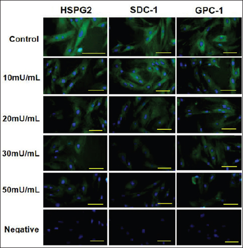 Supplementary Fig. 1. Immunofluorescence staining of proteoglycans HSPG-2, SDC-1, and GPC-1 in porcine pulmonary microvascular endothelial cells treated with heparinase (HPA) III at different concentrations. Microvascular endothelial cells were treated with 0, 10, 20, 30, and 50 mU/ml HPA III for 2 hours, then incubated in fresh medium for a further 6 hours, fixed with 4 % paraformaldehyde, and processed for immunofluorescence. Negative cells without HPA III treatment were incubated with PBS instead of the primary proteoglycan antibody. Bar=40 μm. | ||